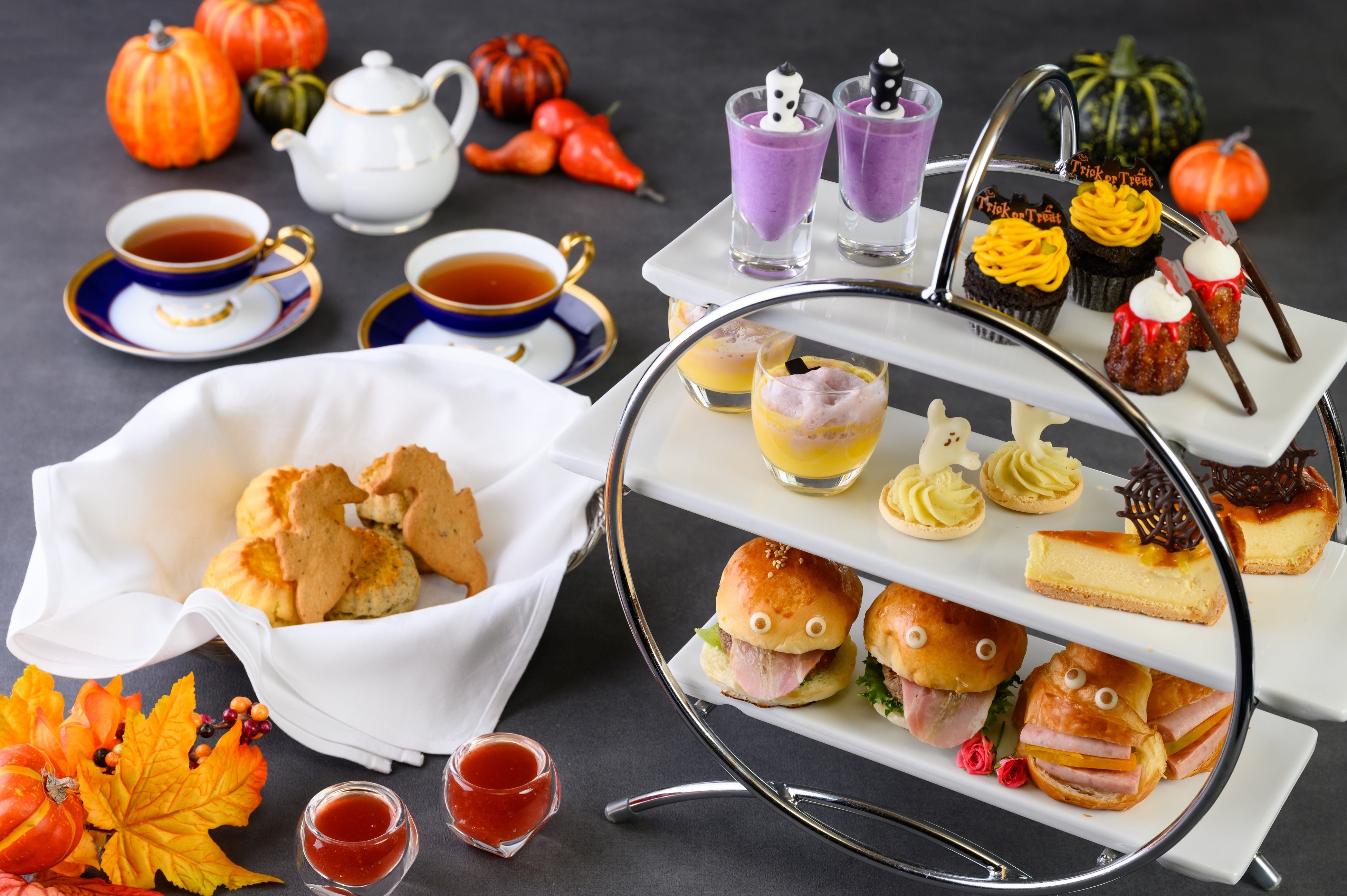 鳥羽国際ホテルのアフタヌーンティーは、月ごとに趣向を変え、ゲストから高評価をいただくメニューのひとつ。10月は、「ハロウィン」をテーマに、コウモリをあしらったかぼちゃのマフィンや、キャンドルをイメージした生カヌレをはじめ、中段にはオバケをあしらったトゥンカロンや、定番のチーズケーキなどのスイーツをご用意。