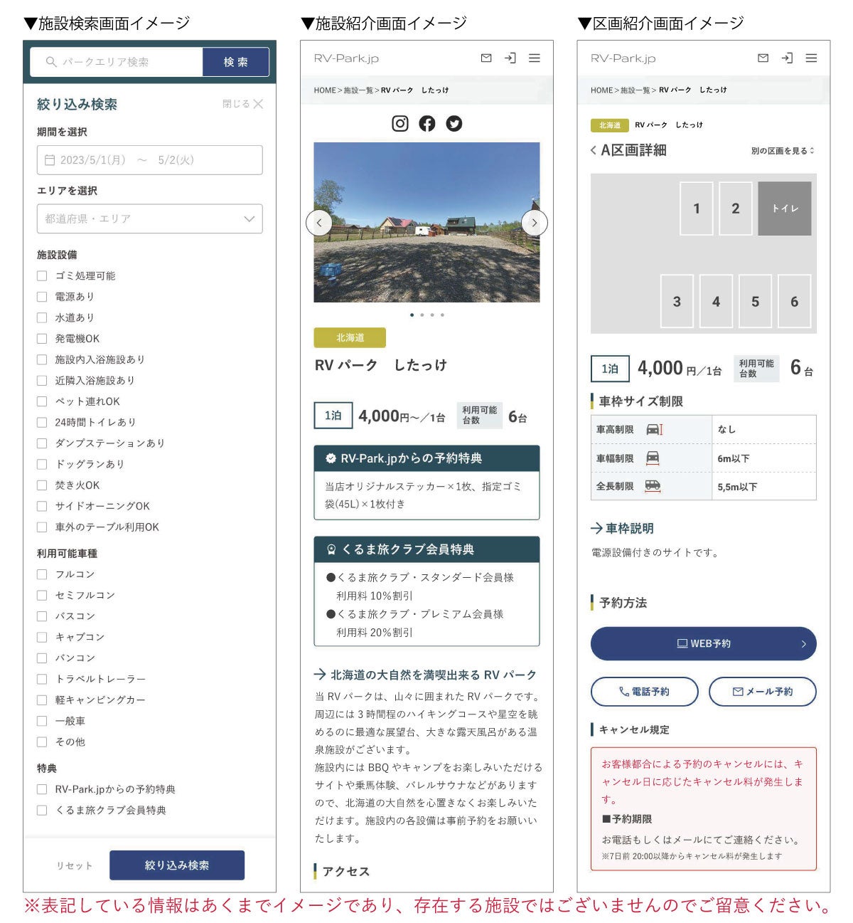 「RV-Park.jp」は、便利な事前決済機能のほか、車中泊日に応じた施設ごとの空き情報を気軽に検索できるなど、ユーザーのニーズに合わせた予約サイトとなっており、本日よりご利用可能となります。