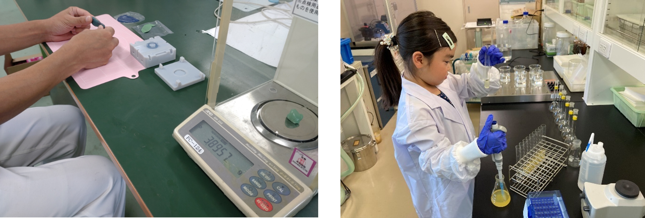 左:ゴム製造スタッフの仕事(シリコーンゴム材料を使用して混練作業を行った後、簡易金型でゴムの成型を行う)