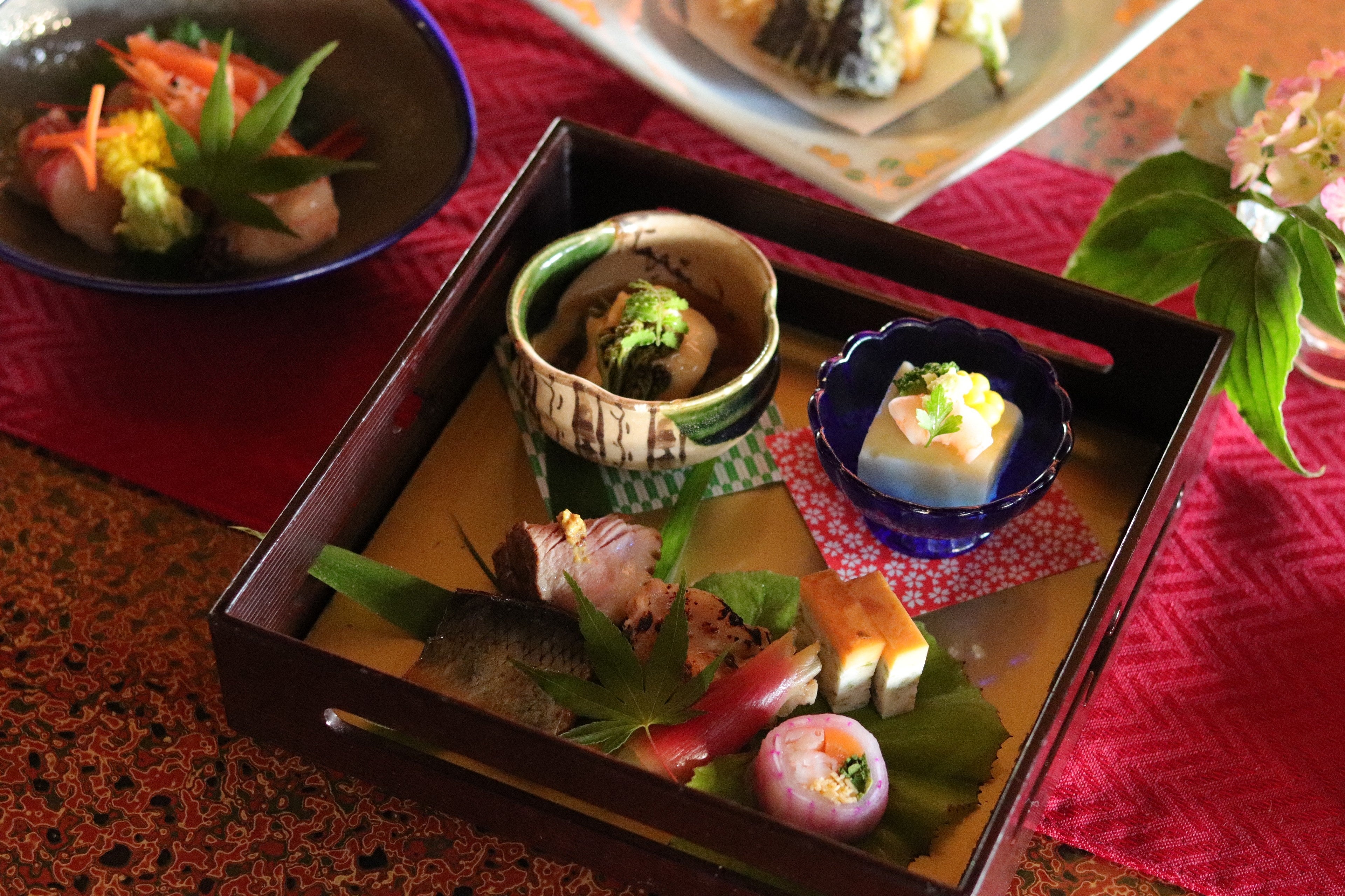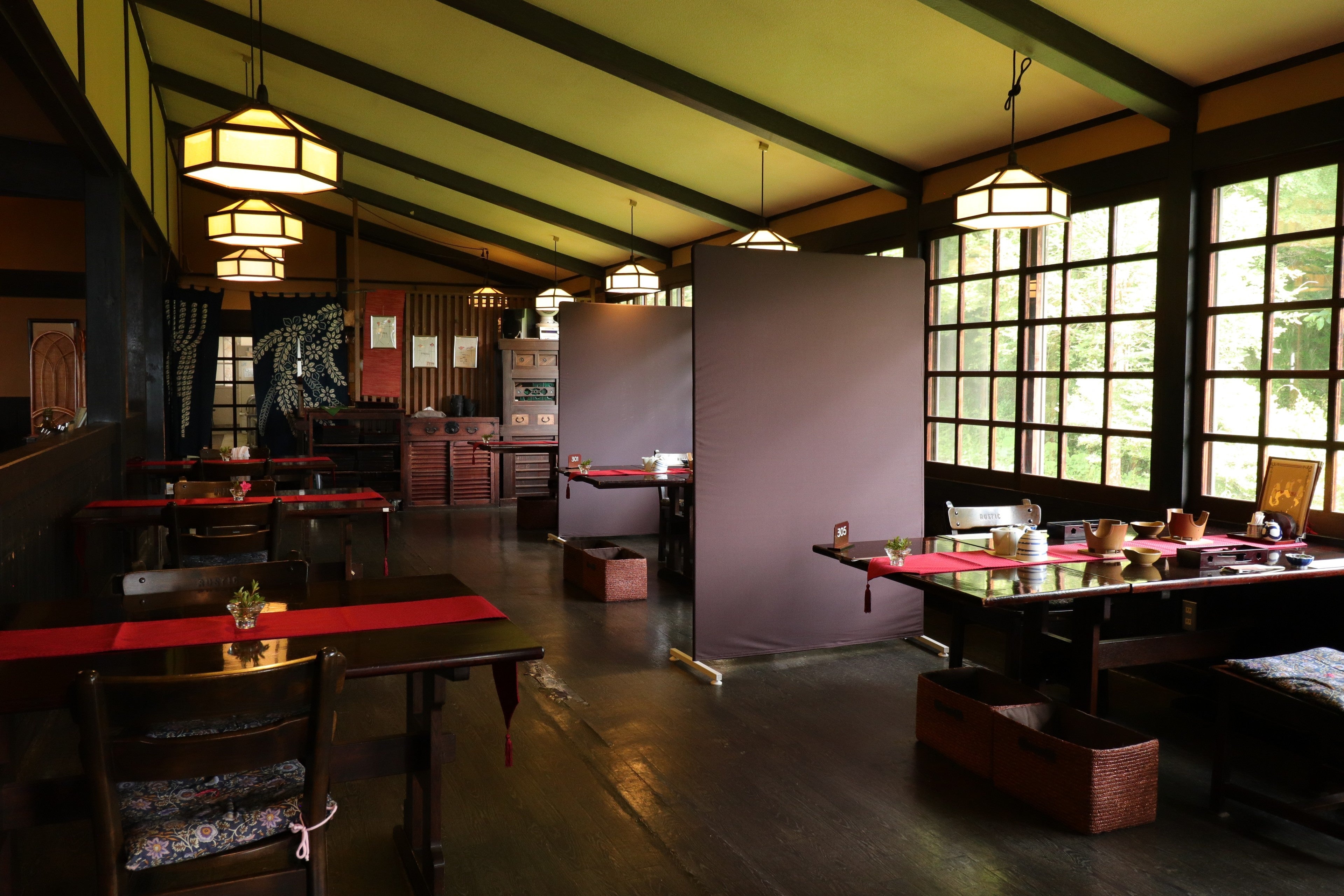 お食事付きのご宿泊プランでは、民芸食堂『合掌庵』にて信州蕎麦や川魚を味わう和会席をご予約いただけます。合掌造りを支える太い曲がり梁や民芸家具など、懐かしさを感じる空間が魅力の一つです。