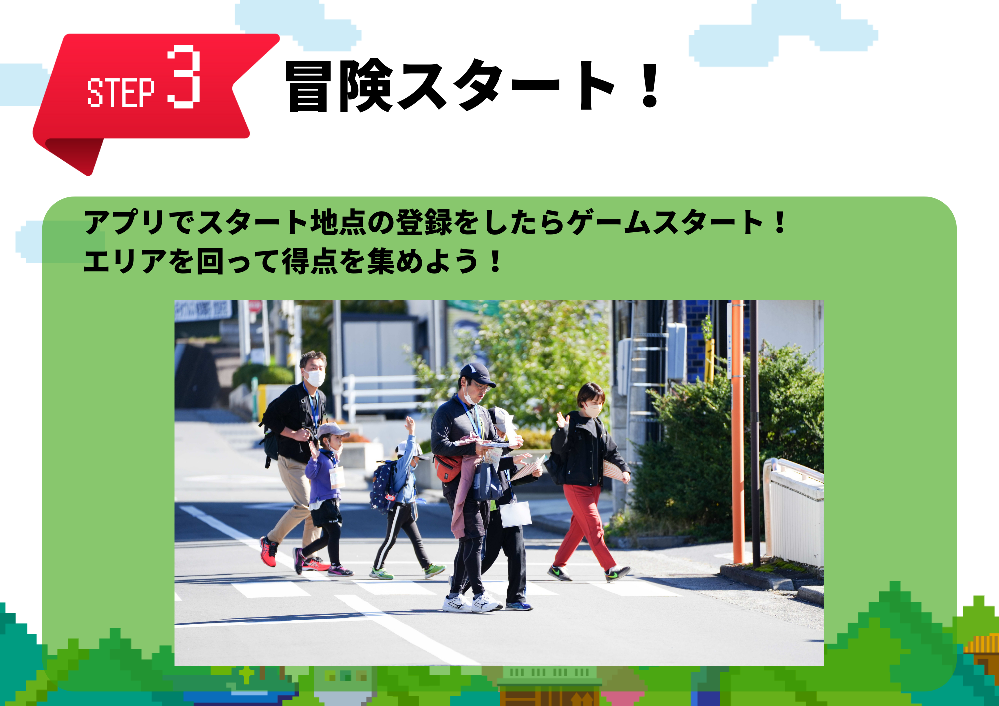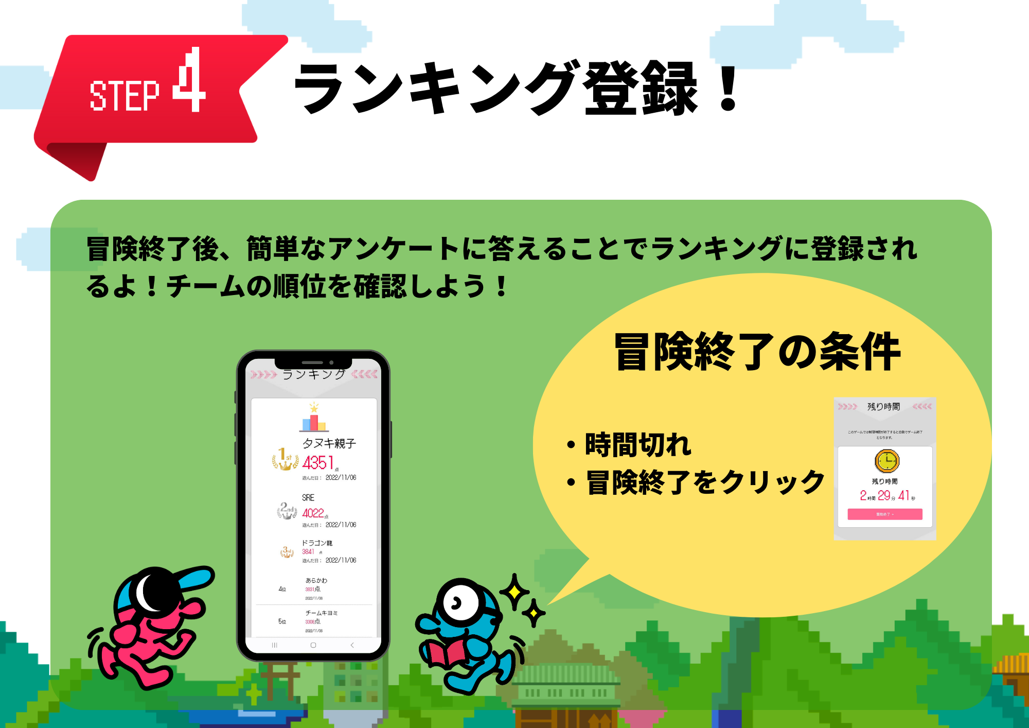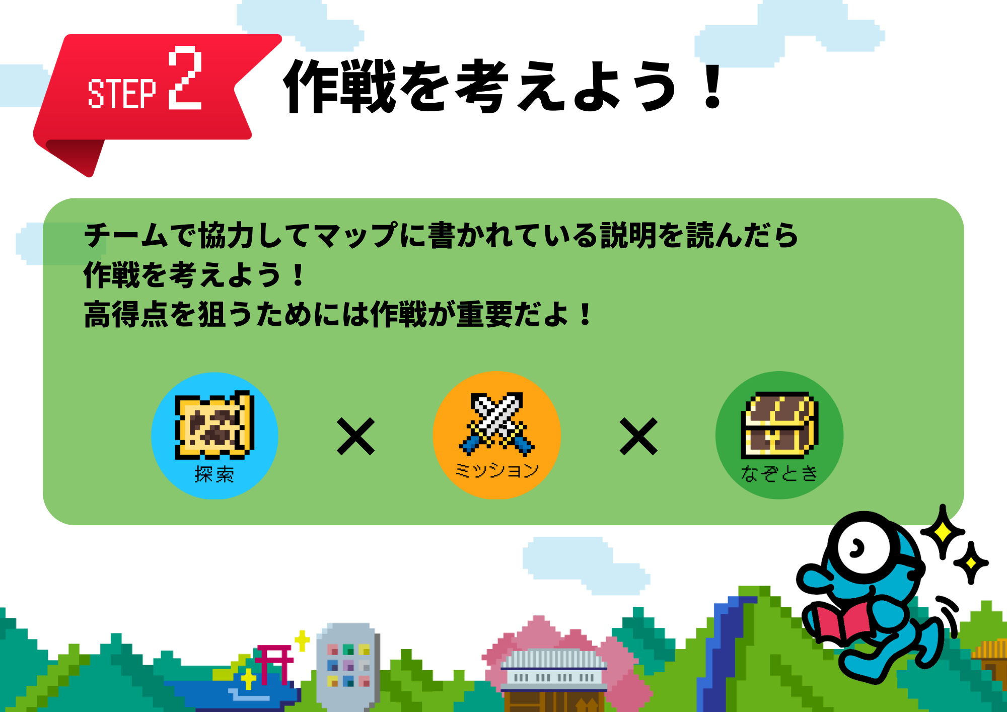 常設型なぞときFUNロゲイニングなら、チェックポイントだけでなく、謎解きやミッションといった要素を組み合わせて得点を稼げるので、RPGゲーム感覚で楽しくエリアを回ることができる。