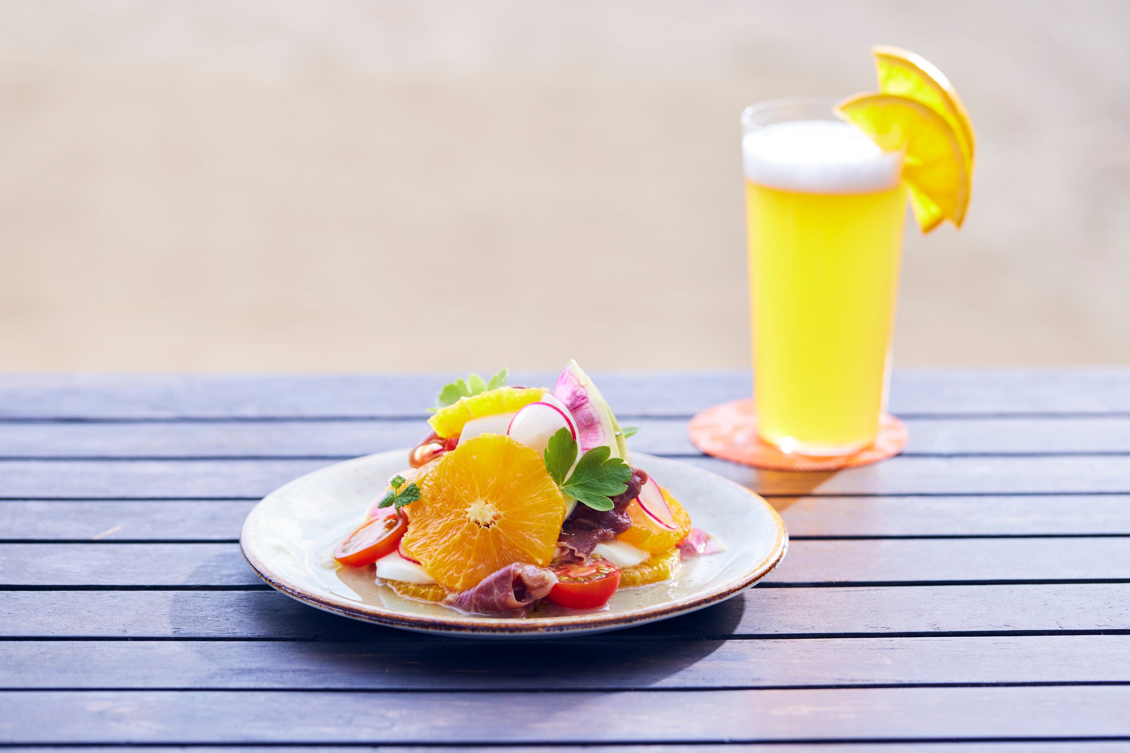 サウナを体験した後は、外気浴を行うウッドデッキスペースでたんかんを使用したサウナ飯とたんかんノンアルコールビールを堪能します。プライベート感溢れるウッドデッキスペースで過ごすサウナ体験後のひとときを演出する、爽やかな味わいのサウナ飯と特製ドリンクです。