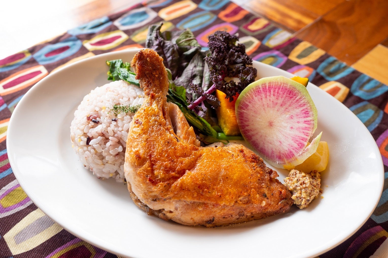 今回は鶏肉をコンフィにし、千葉県産の塩やハーブで味付けをしました。