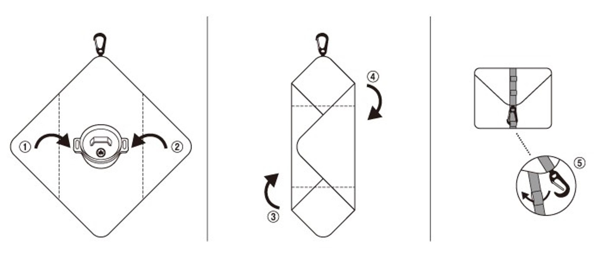 使用方法は、付属のカラビナをドリップベルトに固定するだけの簡単3ステップなので、誰でも簡単に使うことができます。まずは、包みたいアイテムを中心に置いて右左を包むように折り畳み、次に下の端を中心に向かって折り畳みます。最後にカラビナがついている端を折り畳んで、できるだけ遠くにあるドリップベルトのループにカラビナを取り付ければ完成です。