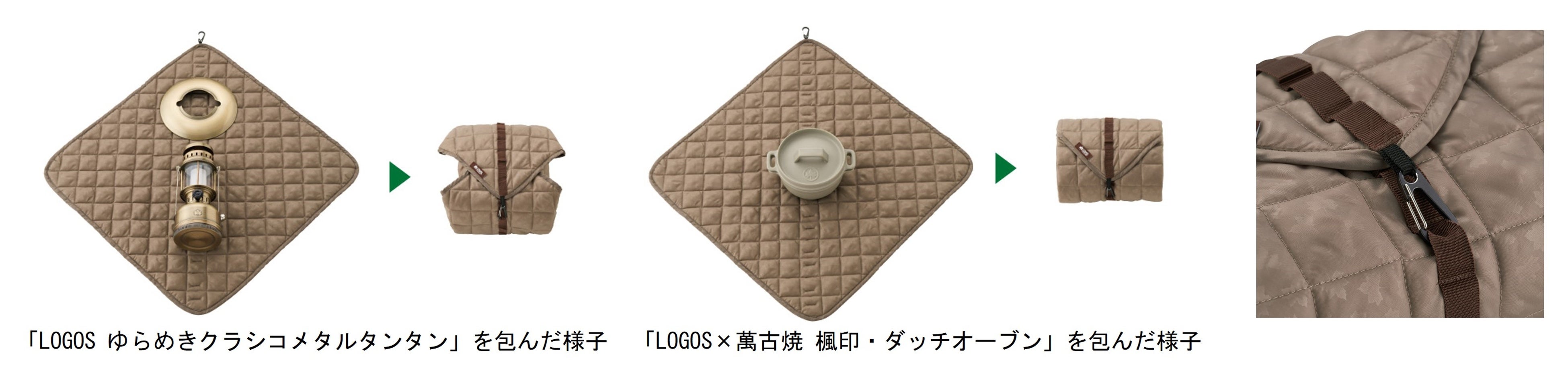 カラビナで固定位置を調節できるため、ダッチオーブンやランタンなど、アイテムに合わせて包むことができる。