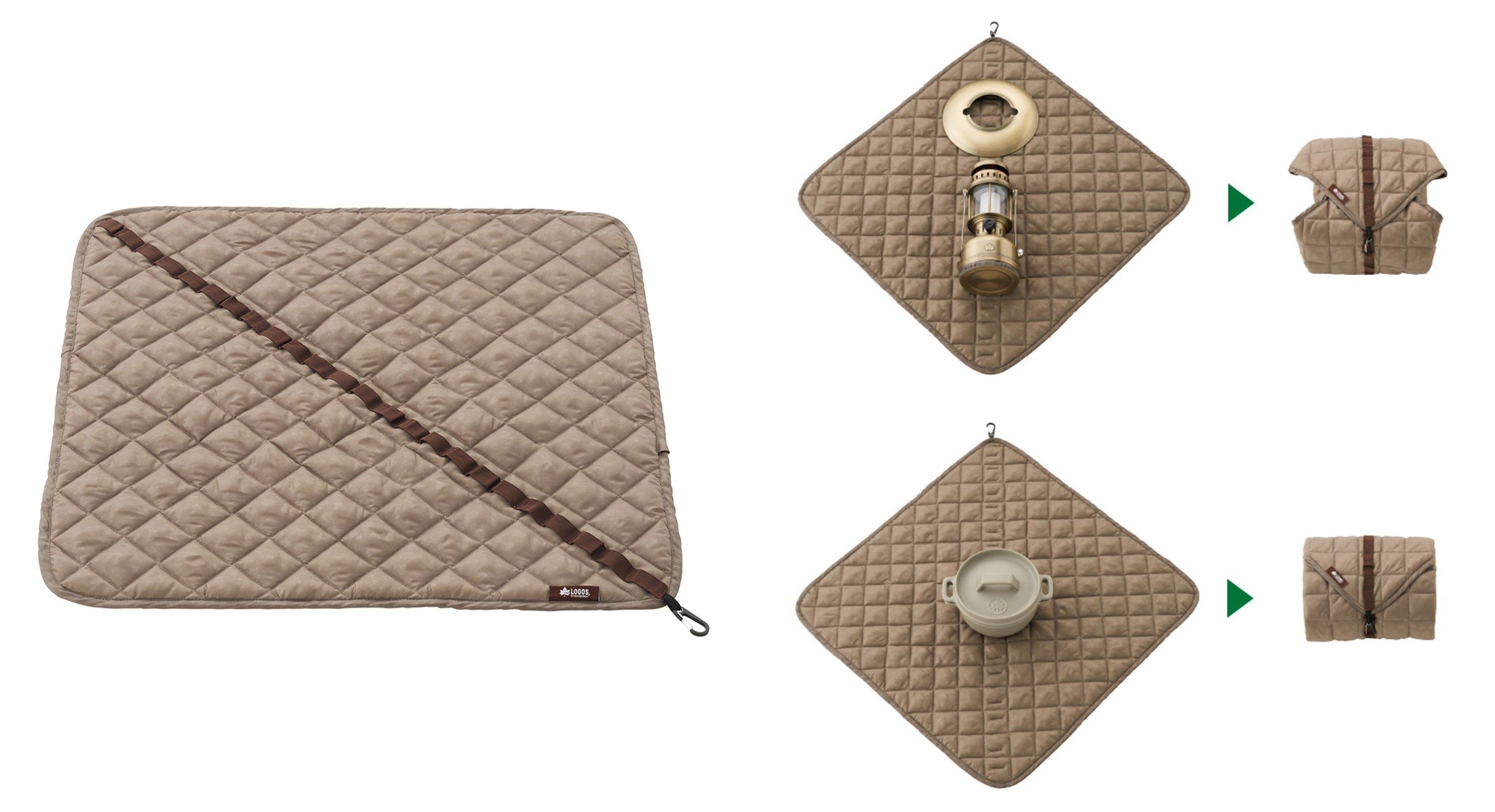 本アイテムは、中綿が入ったキルティング風呂敷です。クッション性があり衝撃をやわらげることができるので、陶器製の容器やランタンなどのアウトドア用品の保管や持ち運びにぴったりです。カラビナとドリップベルトで固定位置を調節できるため、アイテムに合わせてしっかりと包むことが可能で、安心して持ち運ぶことができます。