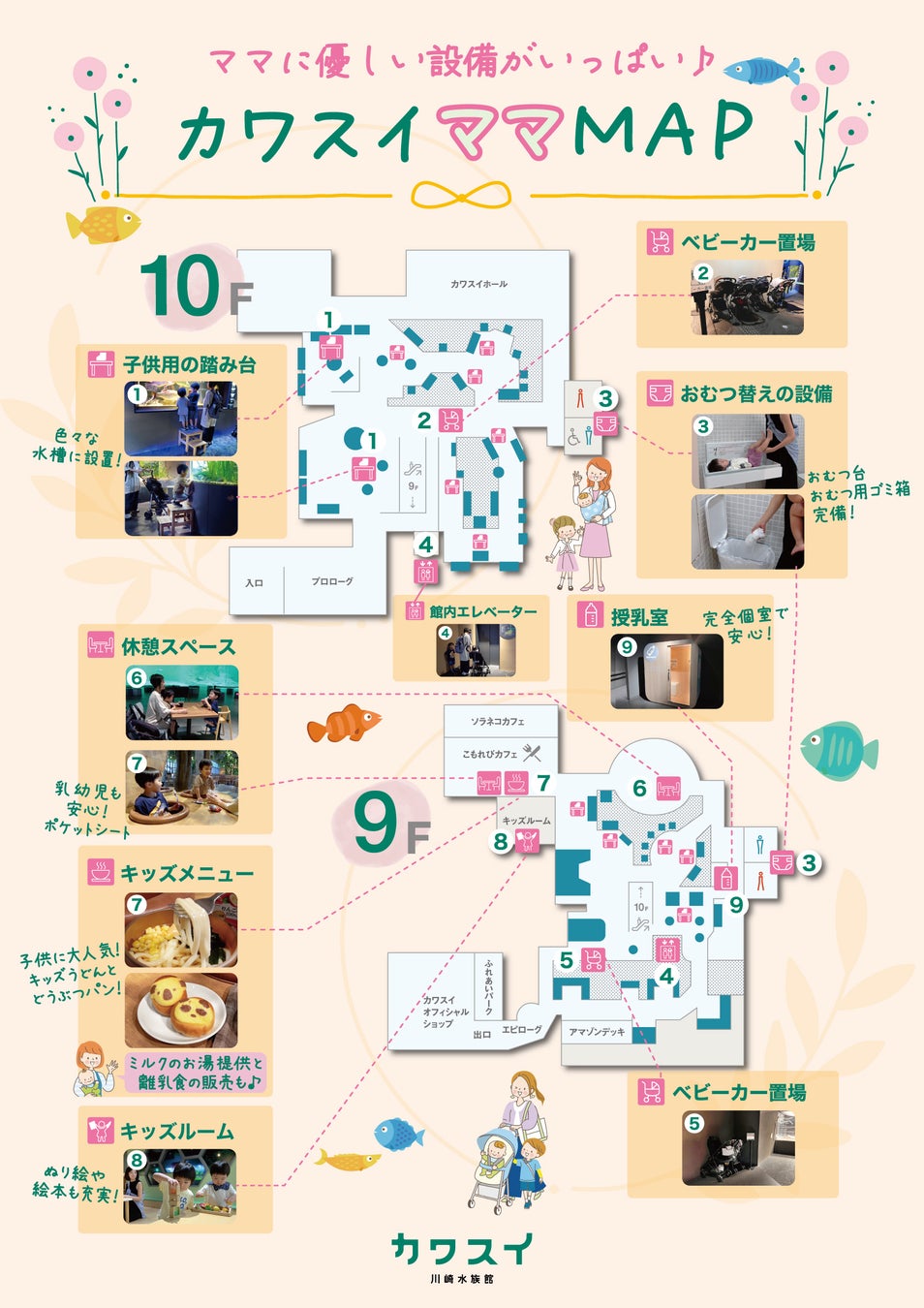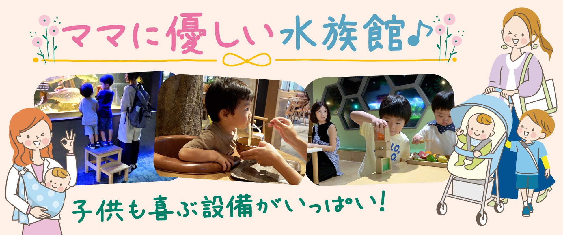 「ママに優しい水族館プロジェクト」とは、乳幼児や小さなお子様連れのママたちに快適に水族館をお楽しみいただくための活動です。既存の館内施設の有効活用のほか、これまで以上に安心してご利用いただける設備やサービスをご用意いたしました。今後もカワスイはお客様のご意見やご要望を積極に取り入れ、充実した水族館を目指してまいります。