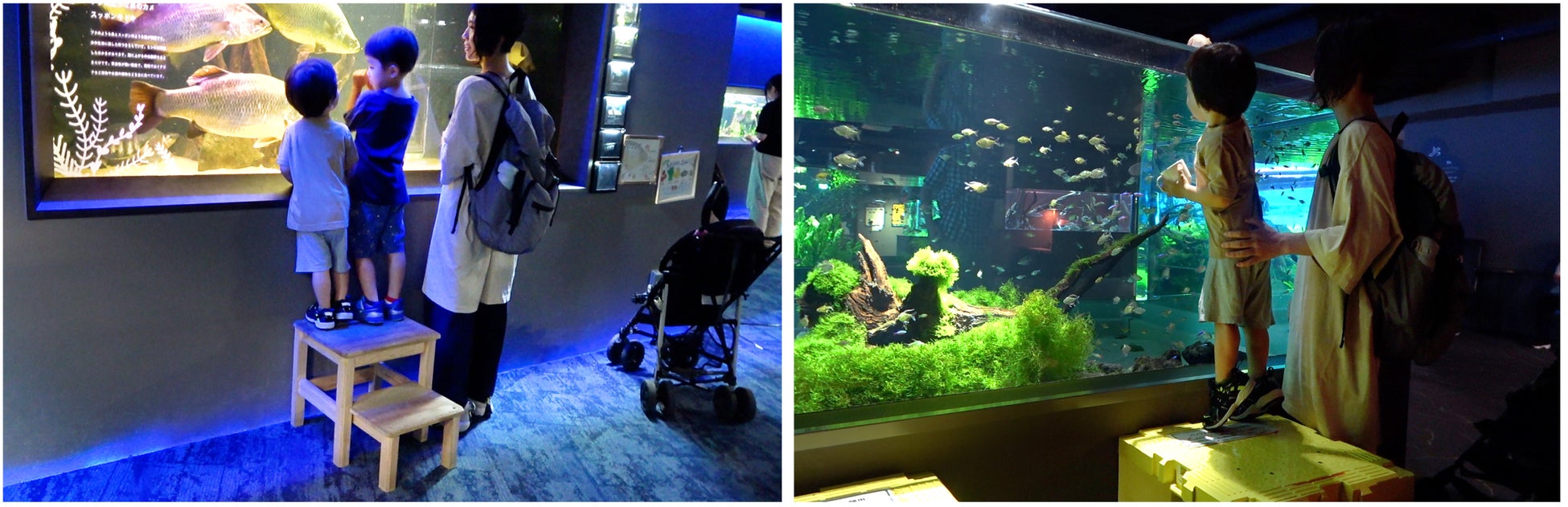 お子様が水槽を見やすいように館内には踏み台を多数ご用意しております。保護者さまが抱っこをし続ける必要なく、快適に生きものをじっくりと観察したり、エサやり体験をすることができます。