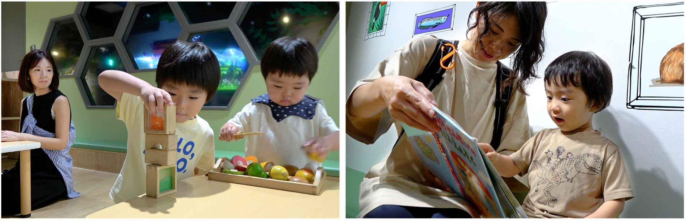お子様が水槽を見やすいように館内には踏み台を多数ご用意しております。保護者さまが抱っこをし続ける必要なく、快適に生きものをじっくりと観察したり、エサやり体験をすることができます。
