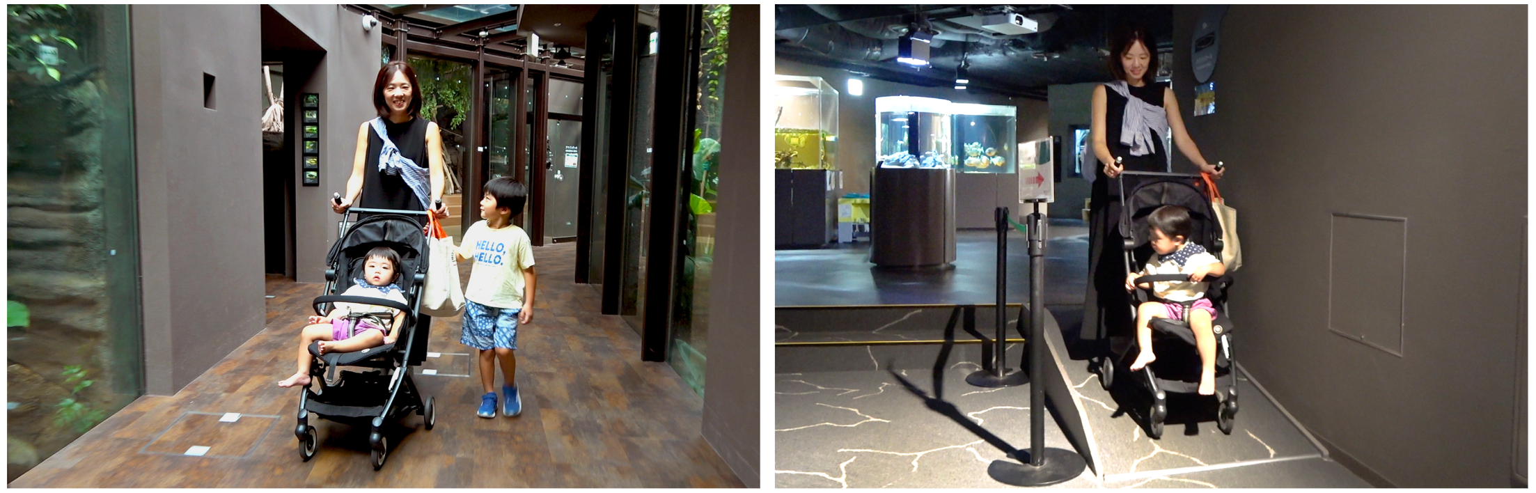 上下階の移動につきましては、館内にある優先エレベーターをご利用ください。館内は段差が少なく、ベビーカーが通りやすいようにスロープを完備しています。