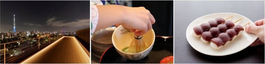 通常ホテル宿泊客のみ利用可能な地上14階のルーフトップテラスですが、当日は一般のお客様も参加可能です。スカイツリー・浅草寺・花やしきなど浅草の夜景と満月を眺めながらお抹茶とお団子を楽しむTHE KANZASHI TOKYO ASAKUSAならではのお月見をぜひご体験ください。