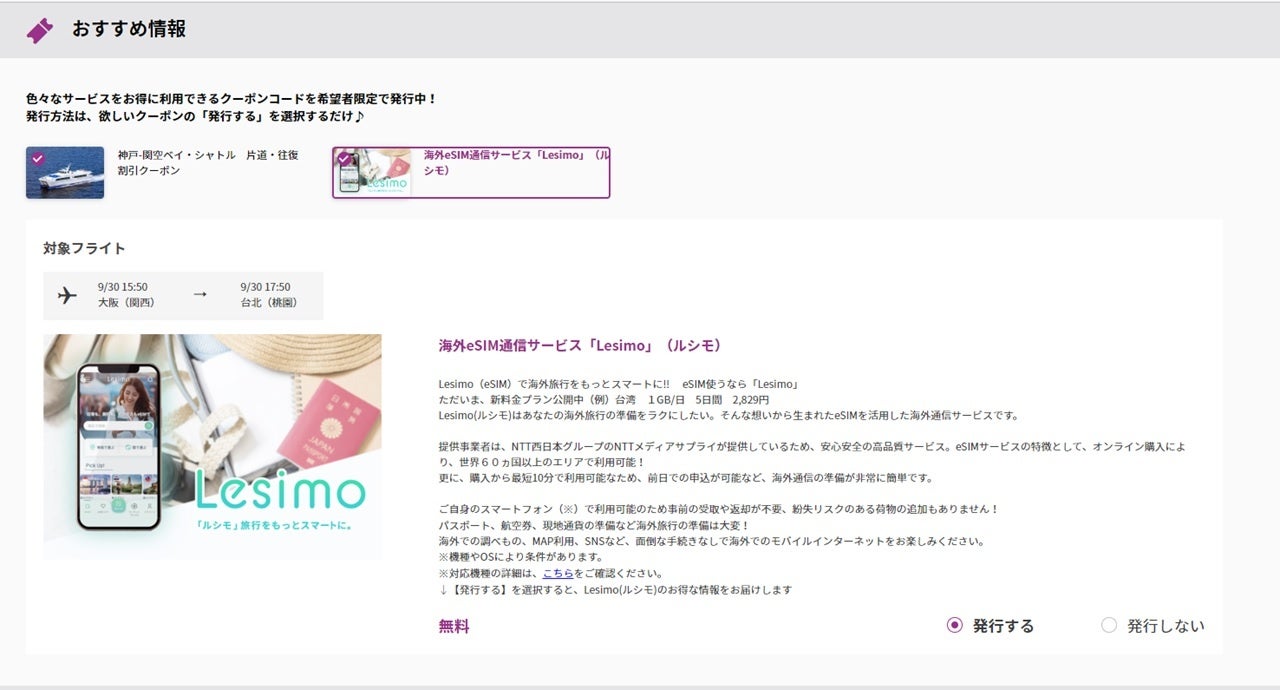NTT西日本グループのエヌ・ティ・ティ・メディアサプライ株式会社(本社:大阪府大阪市、代表取締役社長:伊賀 公治、以下「当社」)が提供する、海外旅行者向けeSIM「Lesimo(ルシモ)」※1は、2023年9月1日より、Peach Aviation株式会社が運営する総合旅行予約サイト「Peach」ならびに搭乗券からも申込・購入いただけるようになりました。