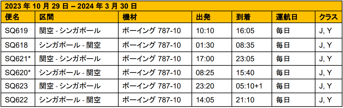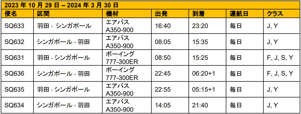 東京(羽田) – シンガポール路線は毎日3便運航が再開されます。この増便により東京発(羽田・成田)便が合計で現行の週28便から週35便となる予定です[1]。
