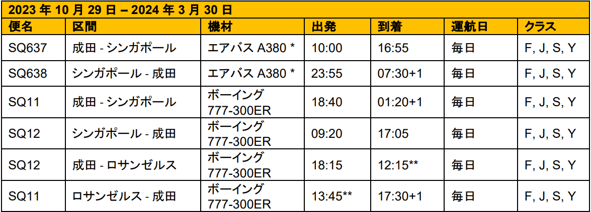 **2023年11月5日~2024年3月9日: SQ11はロサンゼルスを12:45に出発し、成田に17:30(翌日)に到着します。SQ12は成田を18:15に出発し、ロサンゼルスに11:15に到着します。