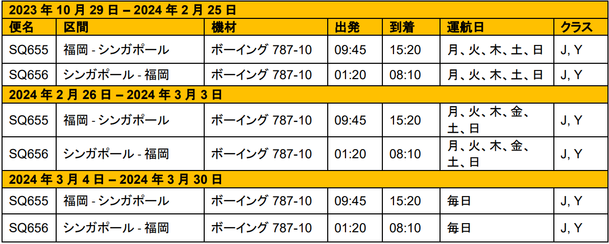 シンガポール発福岡行きは週 5 便に増便します。さらに2024年3月4日よりデイリー運航となり、新型コロナウイルス感染拡大前のレベルまで回復します。
