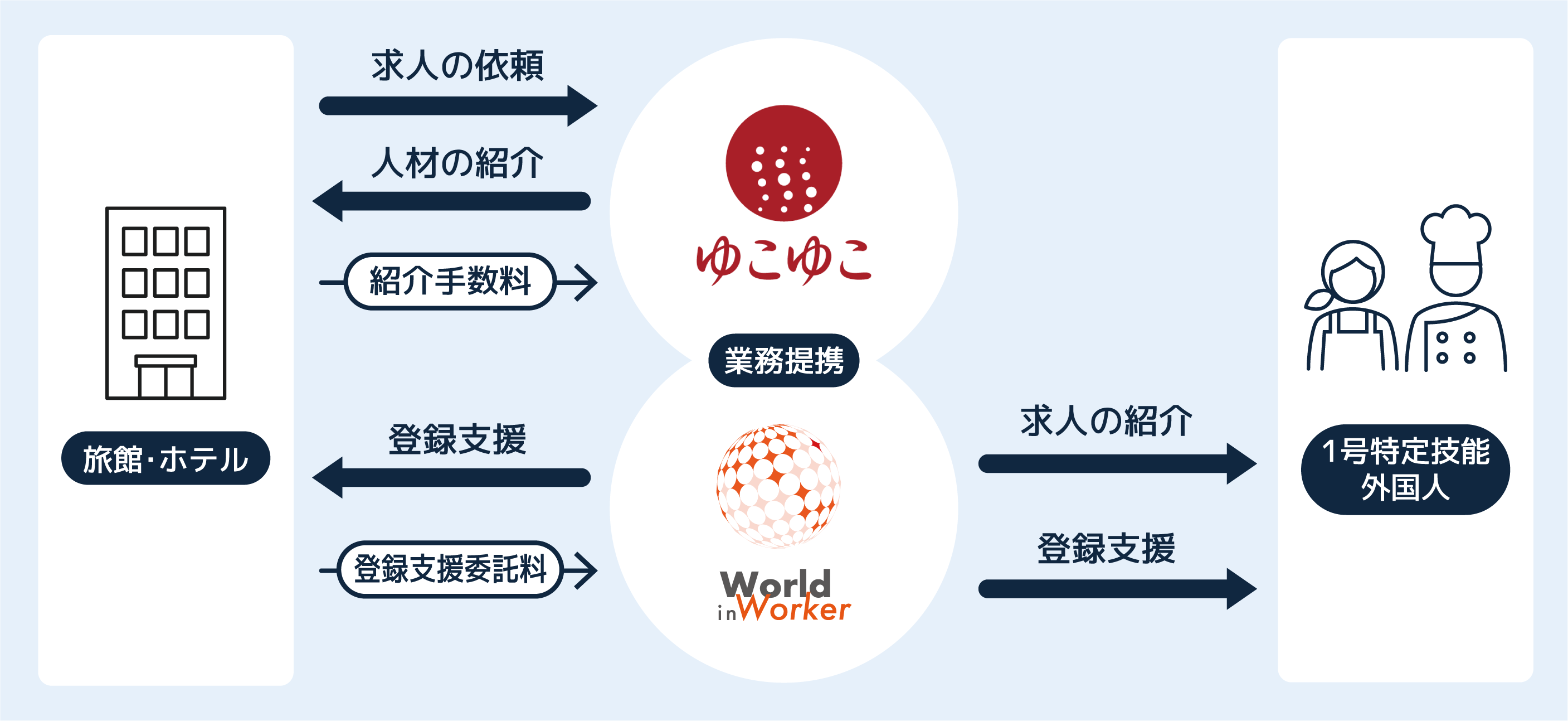 この度の提携により、「ゆくゆく」が保有する宿泊施設の求人に対して、ワールドインワーカーが保有する全国の外国人材データベースから、地方での勤務を希望する方へ仕事を紹介することが可能となり、地方が抱える人手不足の解決に貢献します。