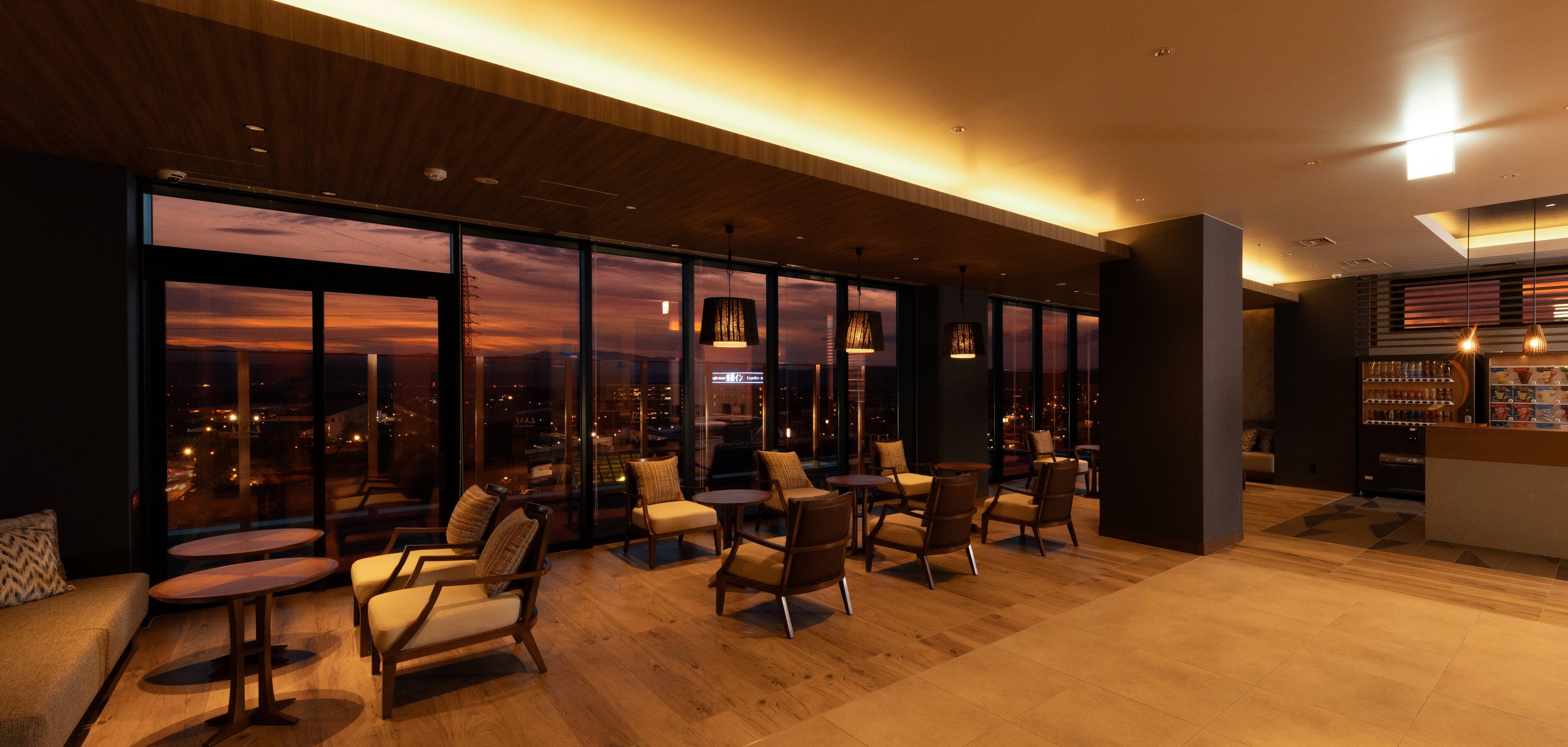 高級感のあるくつろぎの空間。展望テラスから夜景や景色のうつろいをお楽しみいただけます。