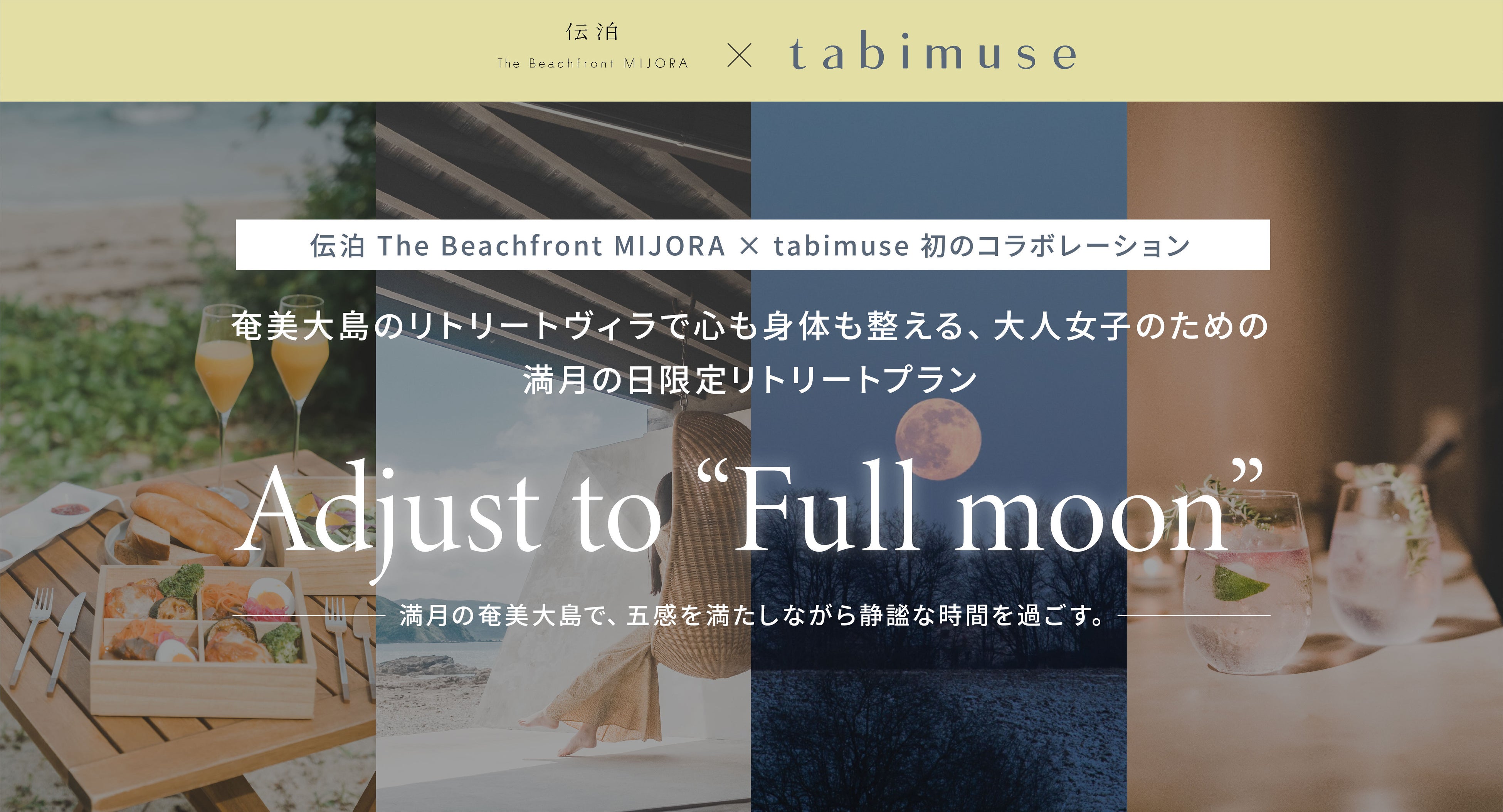奄美群島でまちづくりに取り組み、ヴィラリトリート施設を運営する伝泊(本社:奄美イノベーション 株式会社 鹿児島県奄美市/代表取締役社長:山下保博)と旅行コミュニティメディア「tabimuse」を運営するバリーズ株式会社(本社:東京都港区 代表取締役:野々村 菜美 以下、バリーズ)は、「Adjust to “Full moon”満月の日限定リトリートプラン(https://reserve.489ban.net/client/den-paku-mijora/0/plan/id/166177/stay)の販売を開始いたしました。