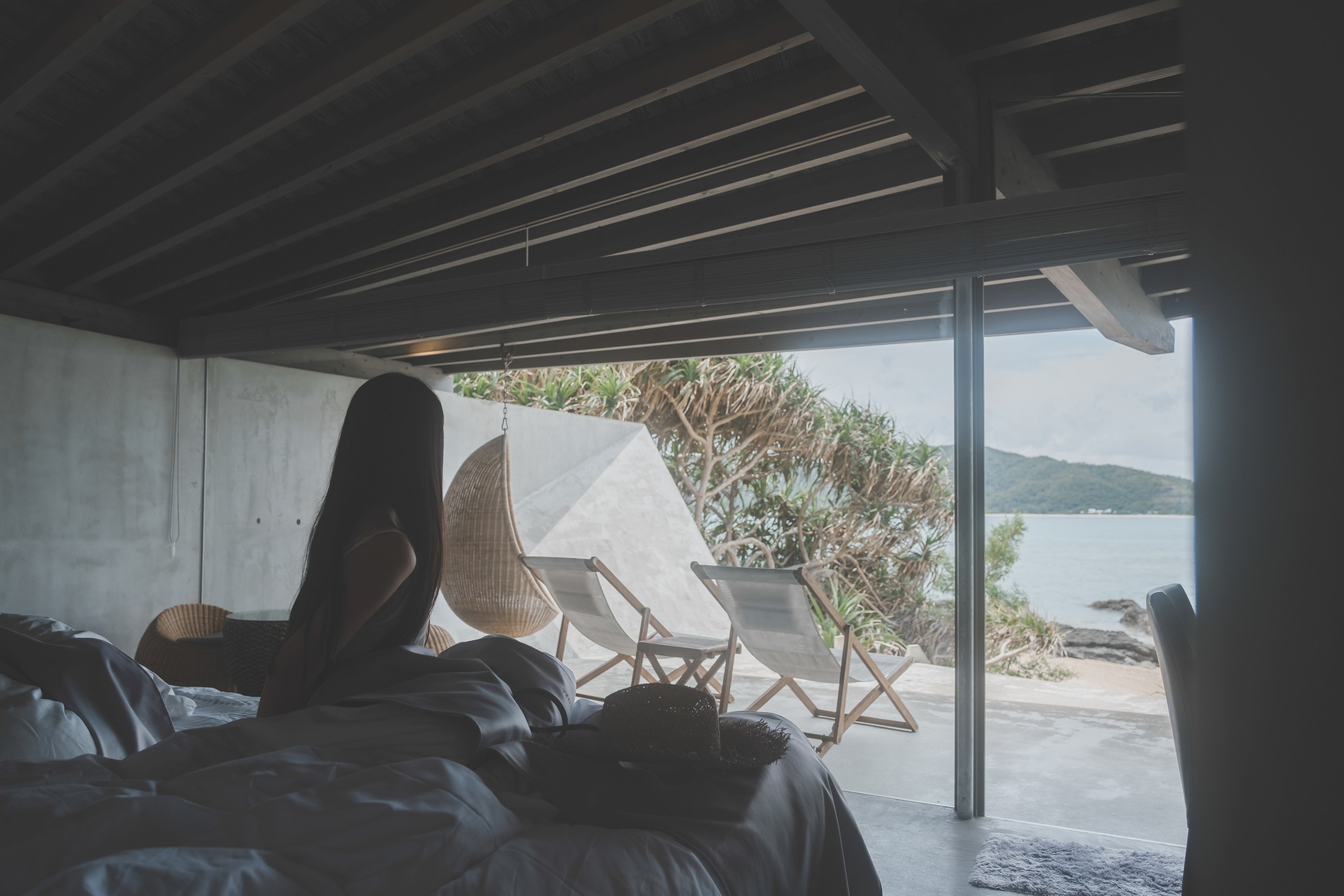 奄美の伝統的な高倉をモチーフにした木組みの屋根とコンクリートのシンプルなつくりが醸し出す禅的空間では、自然と向き合い自分と対話する、静謐な時間が流れます。大きなガラス窓の向こうに広がる海は、すっと心を落ち着かせてくれます。時間とともに移り行く空の色を体感し、波音を聞きながら、自然と一体となるひとときを過ごしていただけます。