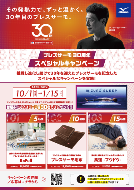 『ブレスサーモ』商品を4,500円(税込)以上お買い上げの方に抽選で、寝具「MIZUNO SLEEP」をプレゼントするキャンペーンを10月1日から2024年1月15日まで開催します。