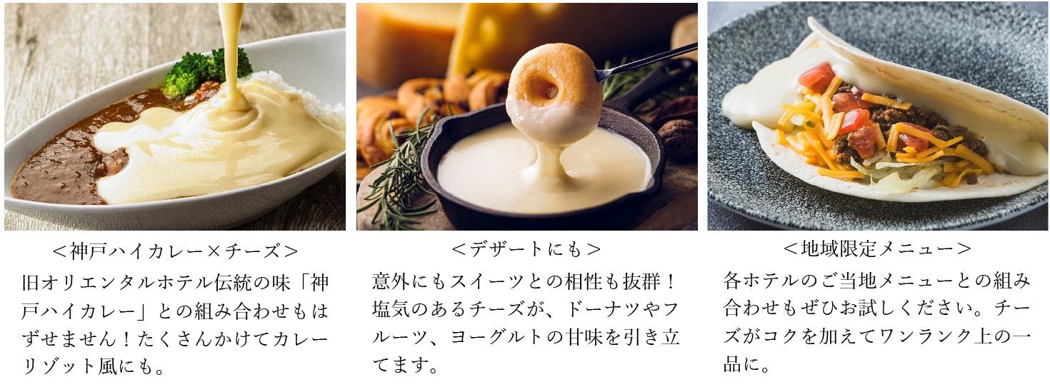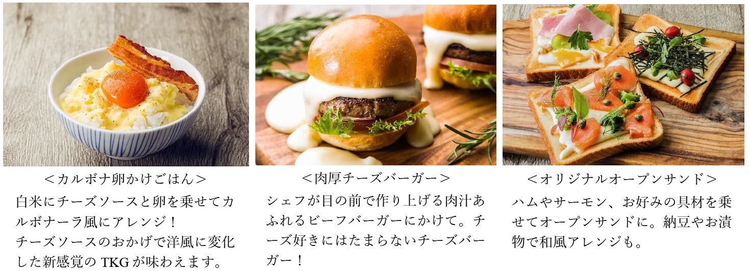 今回新しく仲間入りするのは、濃厚なチーズソースを使用した「チーズフォンデュ」。野菜や肉料理はもちろん、お好きなメニューに組み合わせて味の変化が楽しめます。「オリエンタルホテルズ&リゾーツ」がお勧めする組み合わせは、ウインナーを挟んだクロワッサンにチーズソースをかけて味わう『クロワッサンドッグ』や、白米にチーズソースと卵を乗せてカルボナーラ風にアレンジした『カルボナ卵かけごはん』、一口サイズのハッシュドポテトにチーズソースとサルサソースを混ぜ合わせた『ナチョス風ハッシュブラウン』。その他、沖縄では「タコライス」や「ポークたまごおにぎり」、福岡では「博多とんこつラーメン」や「博多明太子フランス」など、ご当地メニューとの相性も抜群です。その日の気分に合わせて、自分の好みのオリジナルメニューを見つけて、ワンランク上の朝食時間をお楽しみください。