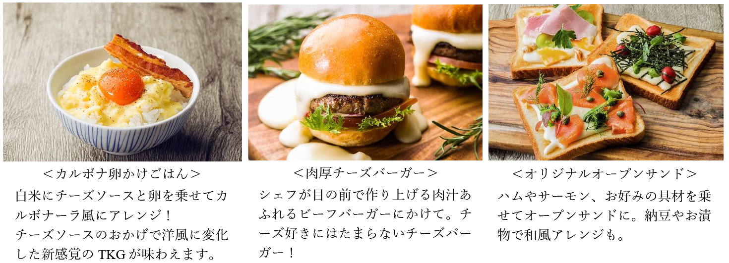 今回新しく仲間入りするのは、濃厚なチーズソースを使用した「チーズフォンデュ」。野菜や肉料理はもちろん、お好きなメニューに組み合わせて味の変化が楽しめます。「オリエンタルホテルズ&リゾーツ」がお勧めする組み合わせは、ウインナーを挟んだクロワッサンにチーズソースをかけて味わう『クロワッサンドッグ』や、白米にチーズソースと卵を乗せてカルボナーラ風にアレンジした『カルボナ卵かけごはん』、一口サイズのハッシュドポテトにチーズソースとサルサソースを混ぜ合わせた『ナチョス風ハッシュブラウン』。その他、沖縄では「タコライス」や「ポークたまごおにぎり」、福岡では「博多とんこつラーメン」や「博多明太子フランス」など、ご当地メニューとの相性も抜群です。その日の気分に合わせて、自分の好みのオリジナルメニューを見つけて、ワンランク上の朝食時間をお楽しみください。