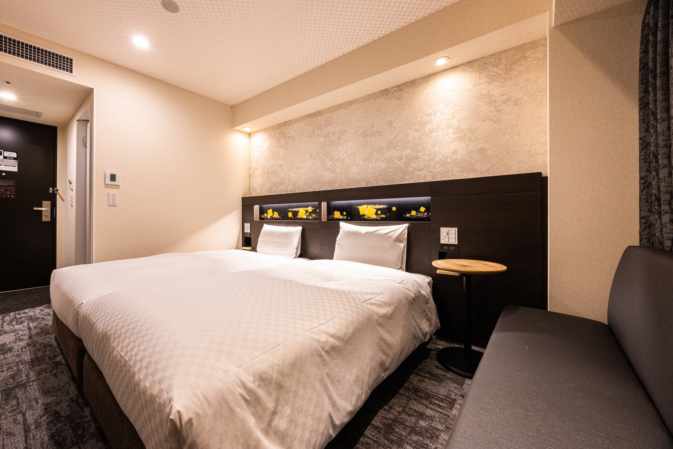 伝統の技と最新技術を駆使したデザインの西陣織物と、 モダンラグジュアリーな調度品を配したロビーでゲストを迎えます。 京町家独特の通り庭を感じさせる廊下のカーペットは、 京都の石畳をイメージしました。 西陣織のソファやベッドボード、そして障子窓など。 随所に京都を感じられるお部屋でおくつろぎください。