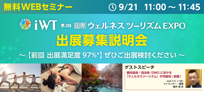 今回のオンラインセミナーは、「販路拡大の機会がない / PRする場がなくて困っている方」「24年度のプロモーション予算で、使い道を検討されている方」「次回出展を検討されている方」に向けたプログラムで構成されています。本展に関する説明だけでなく、well f.m.一般社団法人 理事の善井氏をゲストに迎え、観光協会・自治体・DMOにおけるウェルネスツーリズムの可能性についてお話しいただきます。