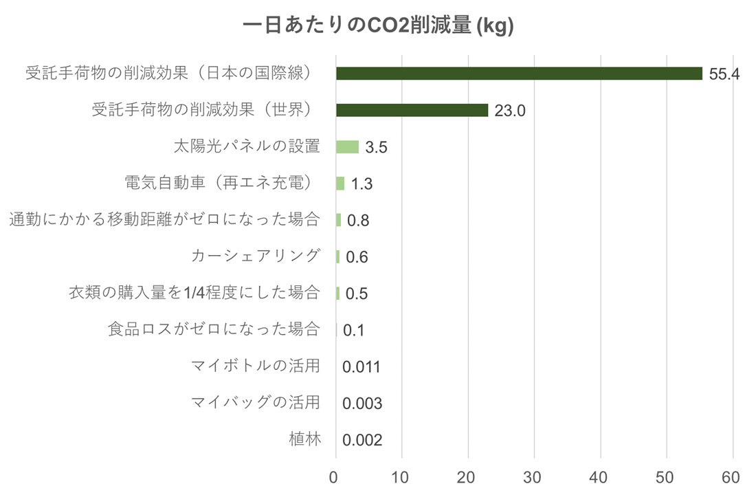 航空業界だけでなく、他のCO2削減策と比較しても受託手荷物の削減による効果は最大級となります。先ほど計算した受託手荷物によるCO2排出量(世界1億451万トン、日本の国際線288万トン)を乗客数(世界45億43百万人、日本の国際線5,196万人)で割るとフライト1人当たりの削減効果は55.4kg、世界全体では23.0kgとなります。この数値は環境省発表の太陽光パネルの設置(3.5kg)、電気自動車利用(1.3kg)など多くのCO2削減策を上回る効果となります。