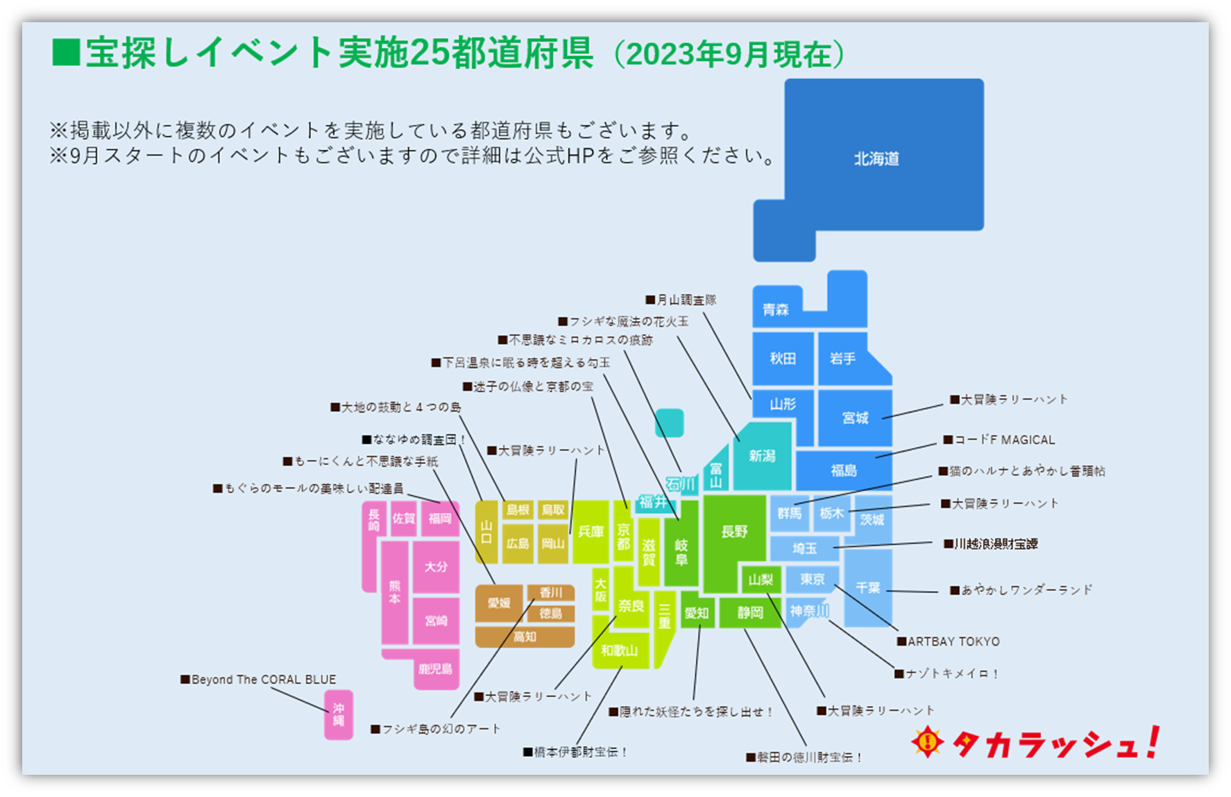 日本全国25都道府県で実施しているタカラッシュの宝探しや謎解き。あなたの街でも実施しているイベントがあるかもしれません。詳しくは下記HPでご確認ください。