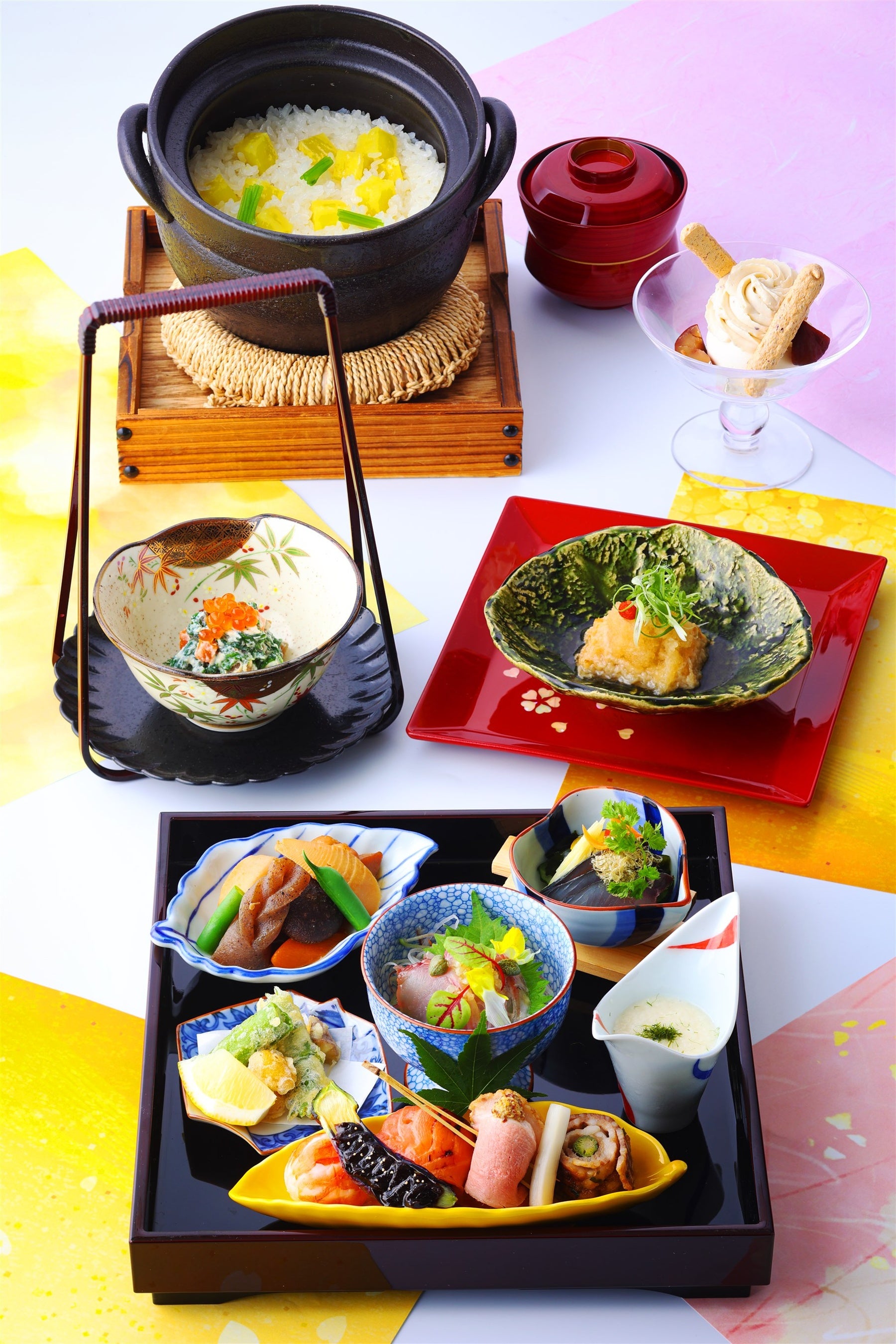 ランチの先付には、これから旬を迎える「春菊白和え」と、栄養価が高くスーパーフードでもある胡桃を使用した「胡桃豆腐揚げ出し」をご用意。和盆に盛られた色とりどりの料理の登場です。秋の味覚である「秋鯖生寿司」や「秋刀魚梅紫蘇揚げ」に「牛肉すきやきロール」など、どれから味わうか迷うほど、見た目にも美しい一口サイズの逸品をお楽しみいただけます。〆には、一組毎に土鍋でふっくら艶やかに炊き上げる「薩摩芋の炊き込み御飯」をどうぞ。食後は、女性に人気の「SATSUKIスイーツ」より栗のグラススイーツをご用意いたします。