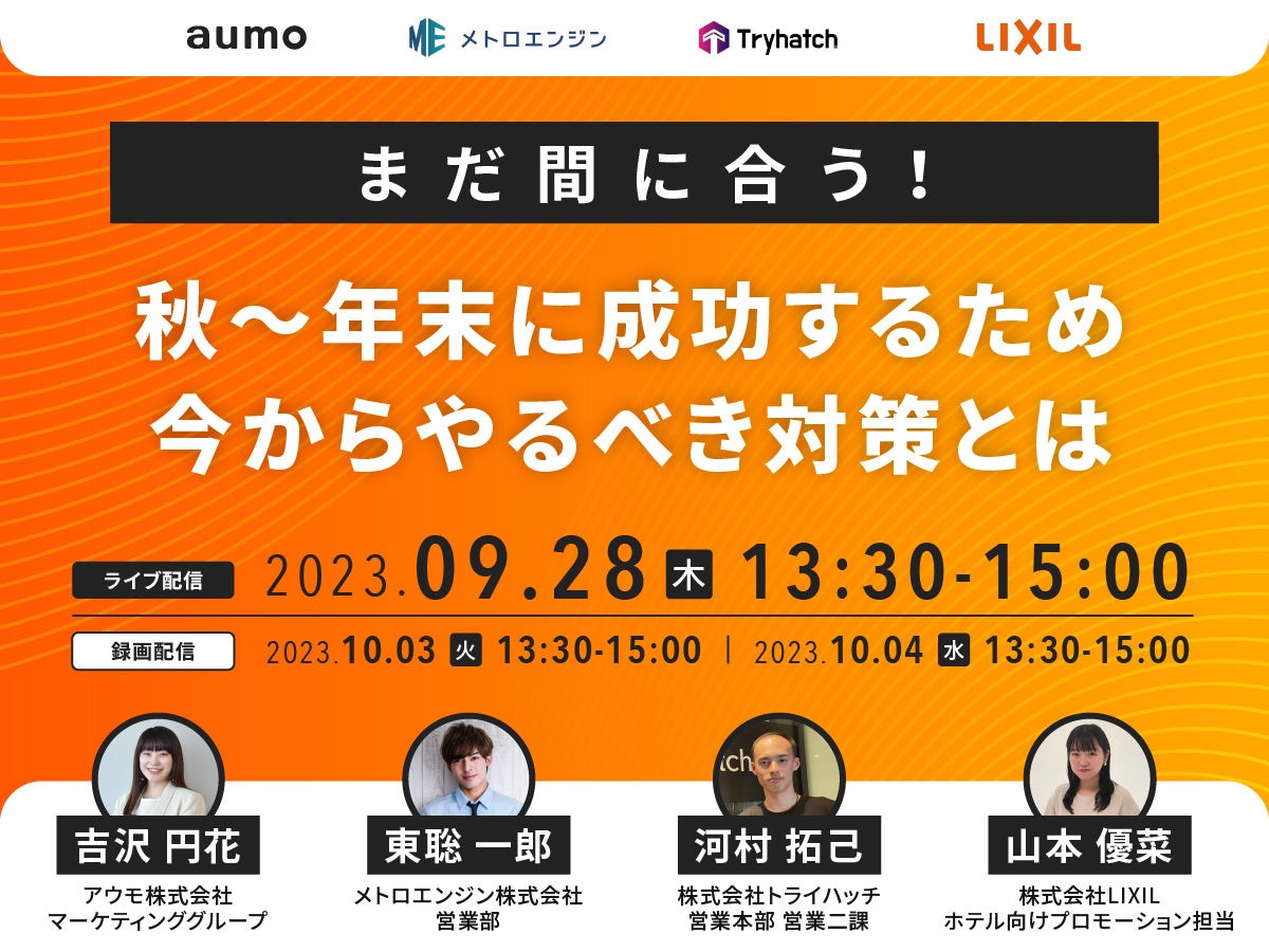 LIXIL以外にも、宿泊事業の集客面をサポートしている、メトロエンジン株式会社、株式会社トライハッチ、アウモ株式会社の3社が登壇されます。