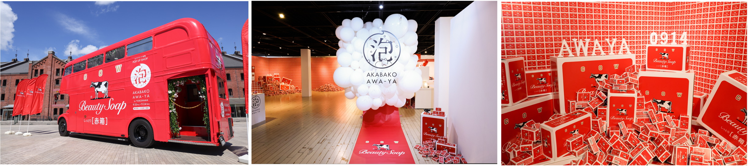 「⾚箱 AWA-YA in YOKOHAMA」の会場内は赤箱の工場に入り込んだようなファクトリー感のある空間に。「AWA-YA」の名物、FIND OLD AKABAKOの展示や人気イラストレーターわたせせいぞうさん書き下ろしのイラスト、横浜美術大学の学生による赤箱アートも展示され、赤箱一色の空間となっております。さらに、赤箱仕様にラッピングされた「赤箱バス」が4年ぶりに登場し、期間限定で横浜周辺と都内を走行します。毎回好評の泡ハンドパックや泡立て体験など装飾以外にも楽しめるコンテンツが盛りだくさんです。