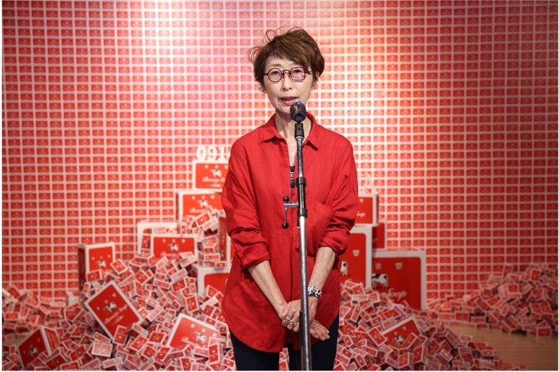 続いて、学生による赤箱をテーマとしたアート作品制作を行った、横浜美術大学より、クラフトデザイン研究室 テキスタイルデザインコース准教授/ 地域連携センター主任 高瀬 ゆり様が登壇。展示されている作品について「学生有志22名の作品で、今回のAWA-YAのイメージをそれぞれの個性を活かして制作し、面白い作品になりましたのでぜひお楽しみください」と紹介。実際に作品を制作した学生の村尾さんは「やさしさで寄り添えるような作品を目指したので、赤箱のように愛される作品になれば」と語りました。
