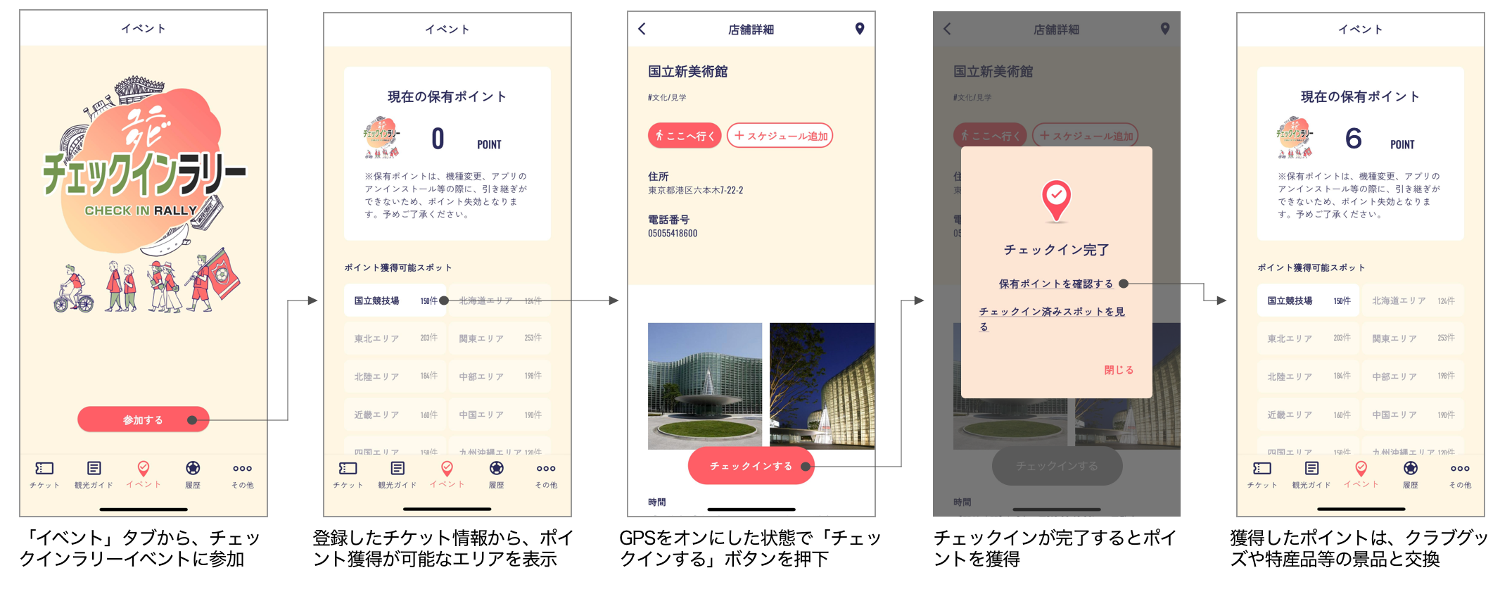 対象期間内に特定のチェックインスポットでチェックインをするとポイントが付与され、付与された合計ポイントに応じて、クラブグッズや各地域にちなんだ特産品などの景品と交換することができます。