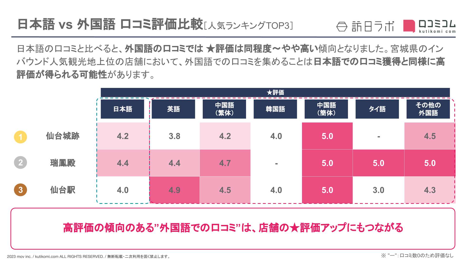 日本語の口コミと比べると、外国語の口コミでは ★評価は同程度〜やや高い傾向となりました。宮城県のインバウンド人気観光地上位の店舗において、外国語での口コミを集めることは日本語での口コミ獲得と同様に高評価が得られる可能性があります。
