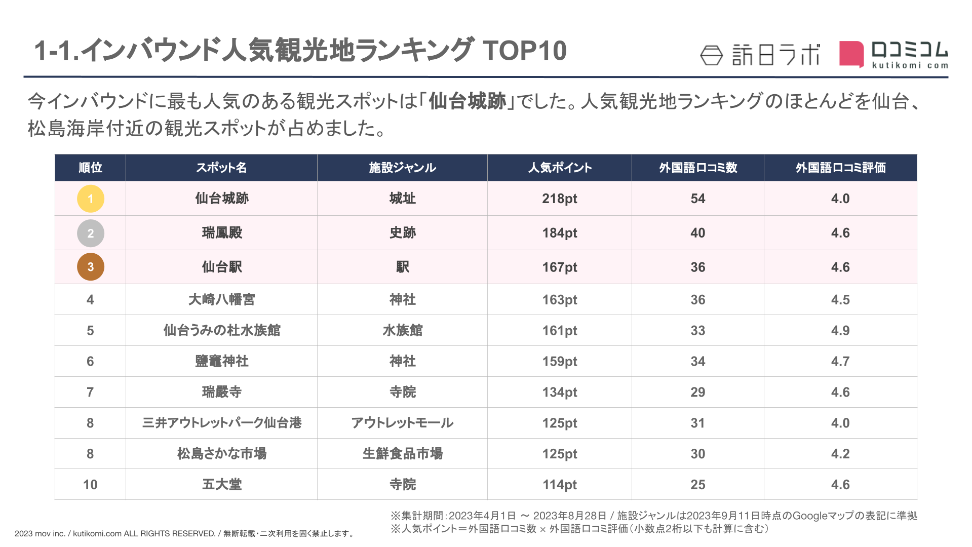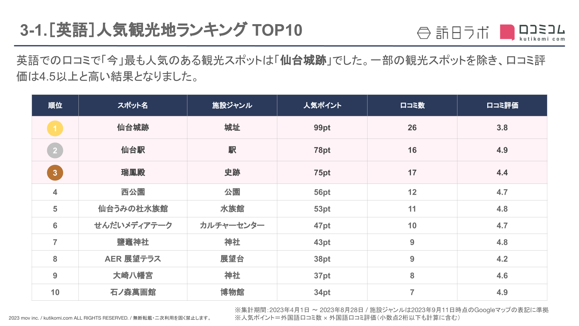 英語での口コミで「今」最も人気のある観光スポットは「仙台城跡」でした。一部の観光スポットを除き、口コミ評価は4.5以上と高い結果となりました。