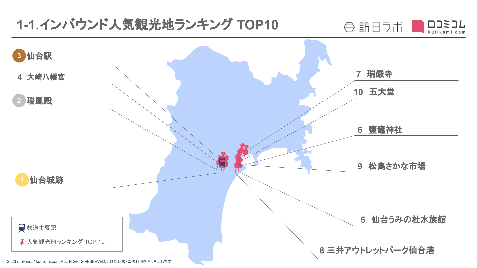 また、ランキングTOP10を宮城県の地図に並べてみると、仙台駅と松島海岸の周辺に人気スポットが集中していることが分かりました。