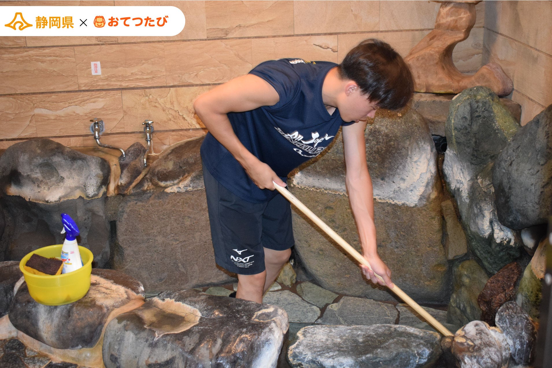 写真:お風呂清掃に取り組む旅行者(静岡県賀茂郡松崎町雲見の民宿「彩雲 俺の家」にて)