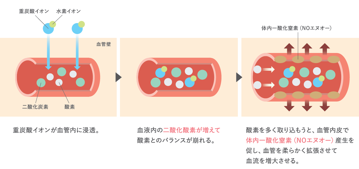 このような問題に対処する一つの方法が重炭酸温浴です。高濃度の重炭酸イオンが温水に溶け込み、皮膚から吸収、血管に浸透することで、血管内で体内一酸化窒素(NO)の生成が促進され、このNOが血管を拡張させて血流を一気に向上させます。