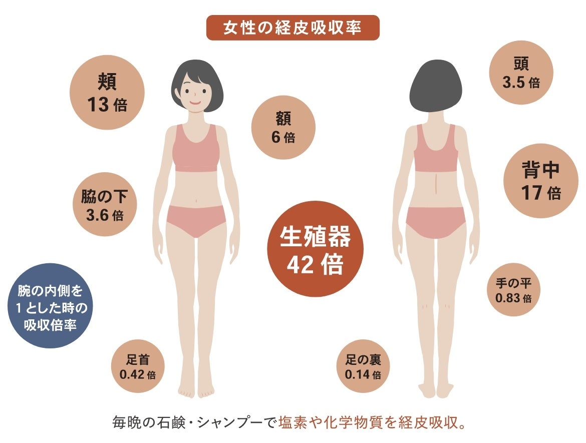 特に女性や赤ちゃんの経皮吸収は高いと言われています(腕の内側を1とした場合、頬(ほお)や顎(あご)は13倍、背中は17倍、粘膜部は42倍)