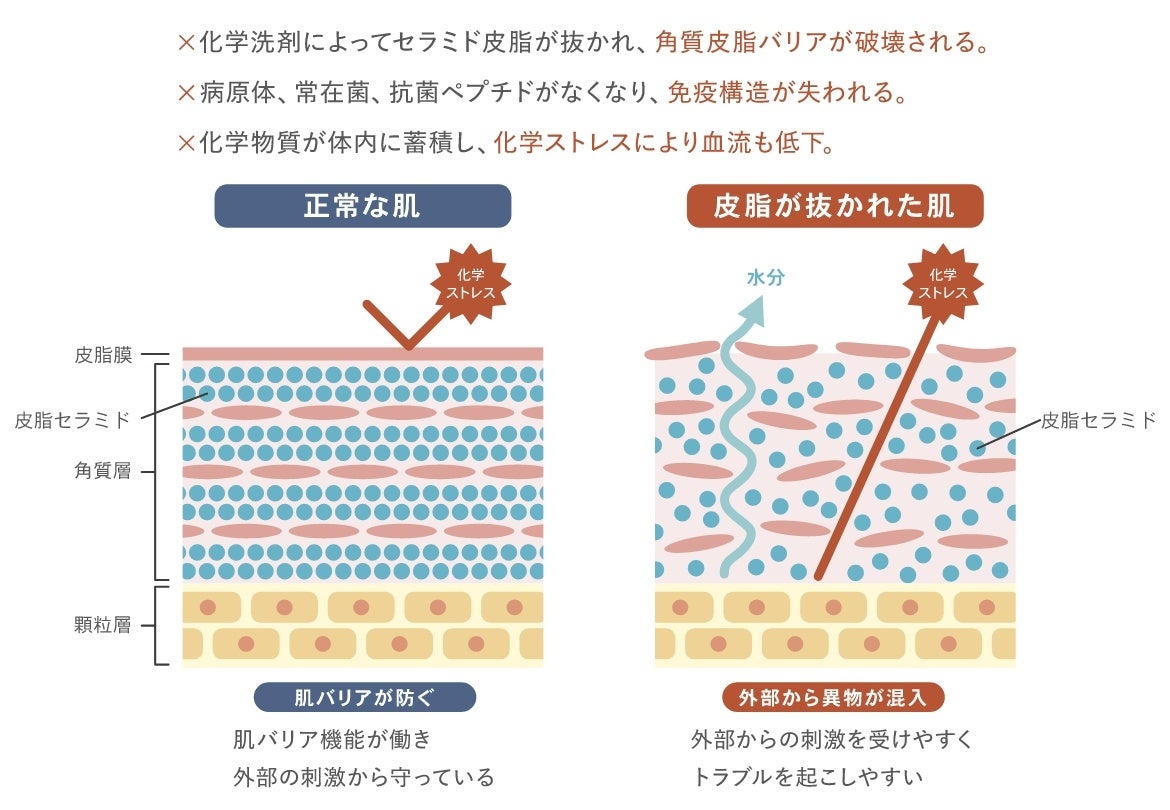 さらに驚くべきことに、化学物質や塩素の経皮吸収も血流低下の原因となることがあります。日常的に使用する石鹸やシャンプーなどの化学洗剤が、肌のセラミド皮脂を洗い流し、化学物質や水道水中の塩素が経皮吸収されることで、自律神経のバランスが崩れ、交感神経が優位になり、血管が収縮して血流が低下すると考えられています。