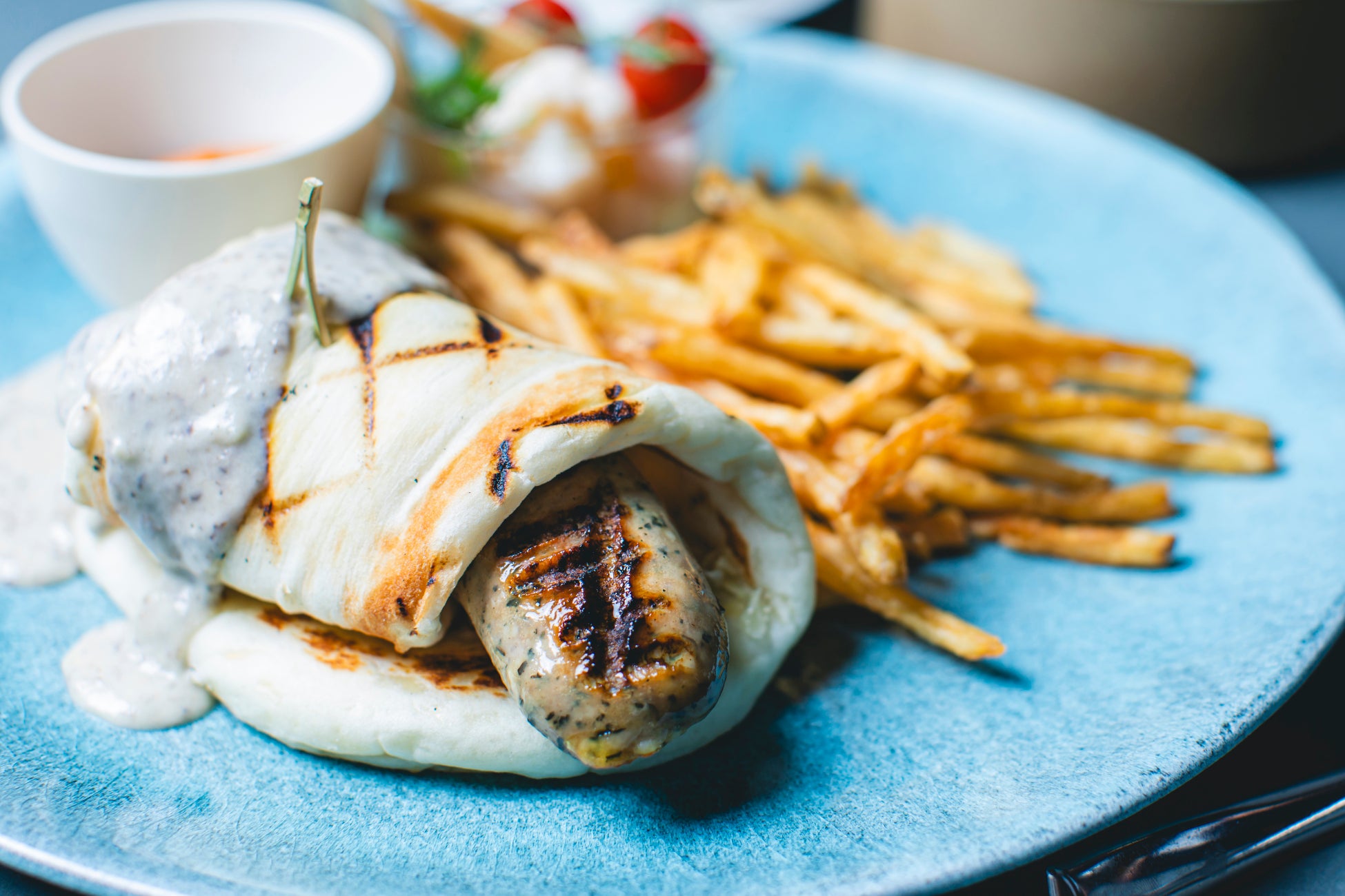 食べ応え満点のソーセージをナンで包み、グリュイエールチーズとトリュフ風味をまとわせた贅沢なホットドッグ