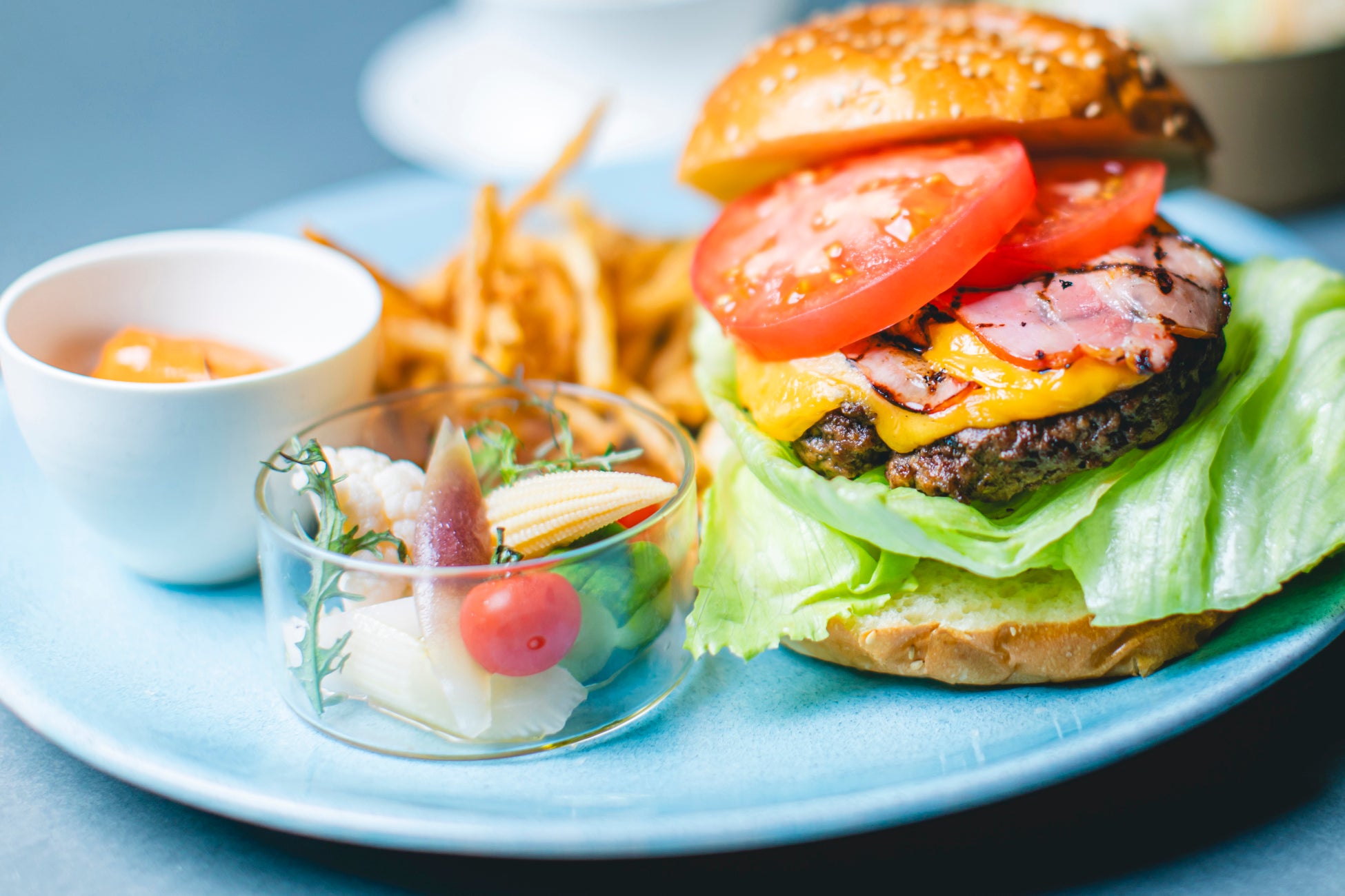 ふかふかのブリオッシュのバンズに、ジューシーなビーフパテ、チェダーチーズ、トマト、レタス、オニオンをサンドしたボリュームたっぷりなシグネチャーバーガー