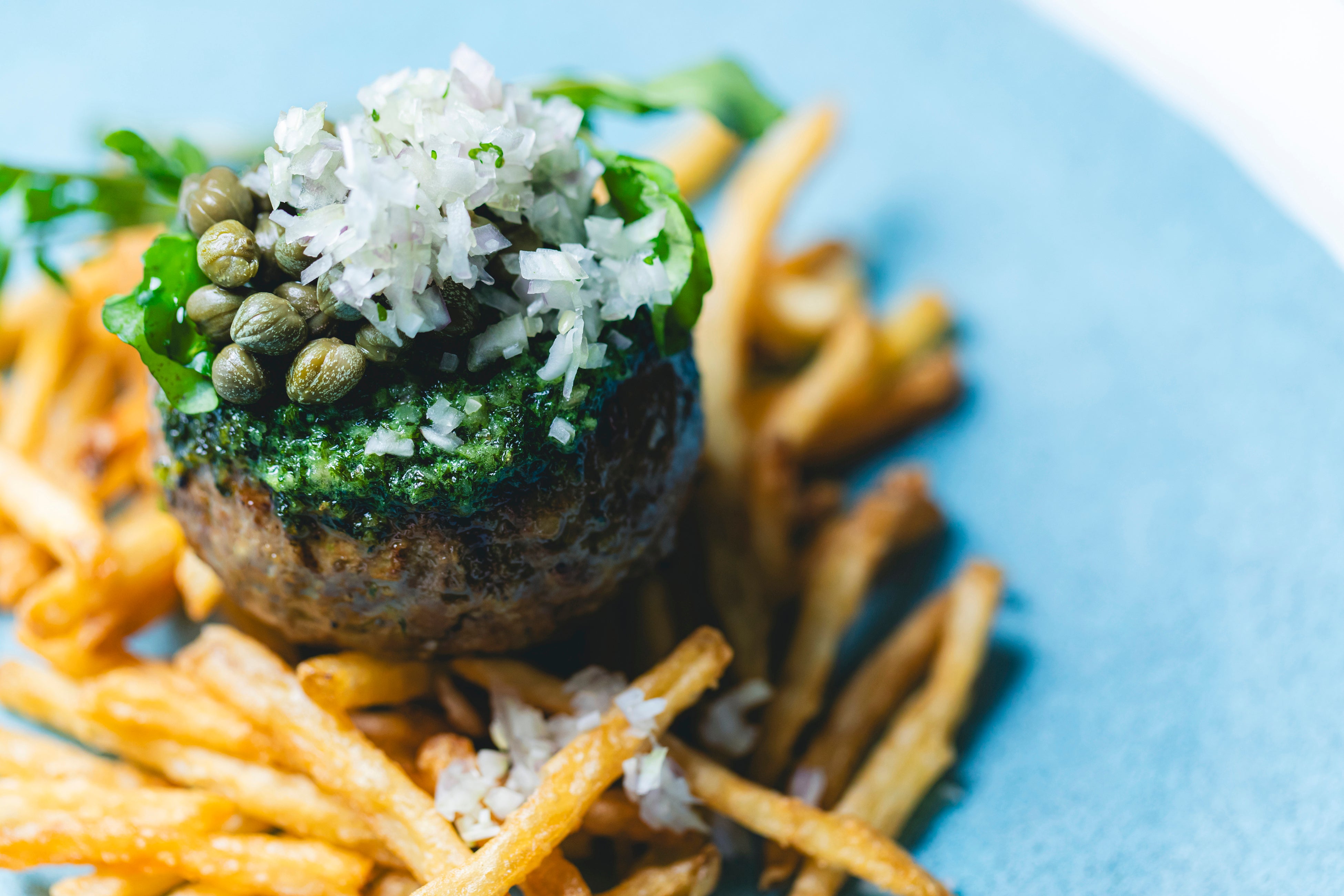 自身のシグネチャーディッシュ。国産牛の良質なもも肉を3種の粗さでミンチにしたものに和牛脂を加え、こだわりの割合で配合。グリーン マスタードでパンチあるテイストに仕上げた挽き肉のステーキ。 付け合わせのポテトやケッパー、 エシャロットと一緒に口に運んで欲しいと思います。 重めの赤ワインとぜひ!
