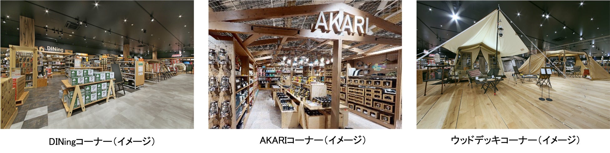 従来の「LIVing」「DINing」「SLEEPing」コーナーに加え、オイルランタンやキャンドルランタンの品揃えを拡充した「AKARI」コーナーなど、多様なシーンに沿った各コーナーで、よりリアルなキャンプシーンや実際の使用感をイメージしながらお買い物を楽しんでいただける売り場を実現。