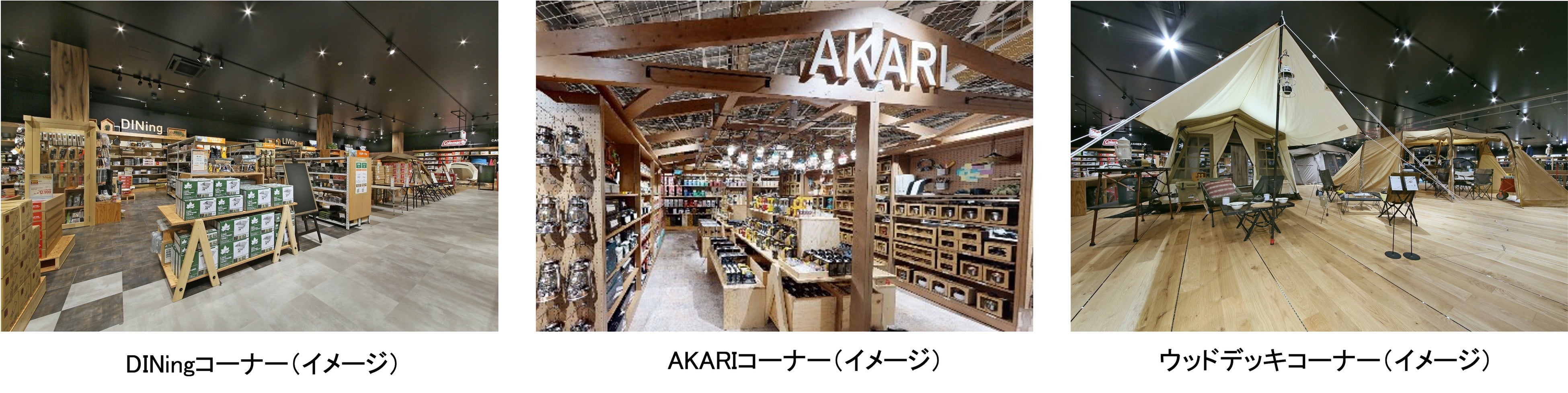従来の「LIVing」「DINing」「SLEEPing」コーナーに加え、オイルランタンやキャンドルランタンの品揃えを拡充した「AKARI」コーナーなど、多様なシーンに沿った各コーナーで、よりリアルなキャンプシーンや実際の使用感をイメージしながらお買い物を楽しんでいただける売り場を実現。
