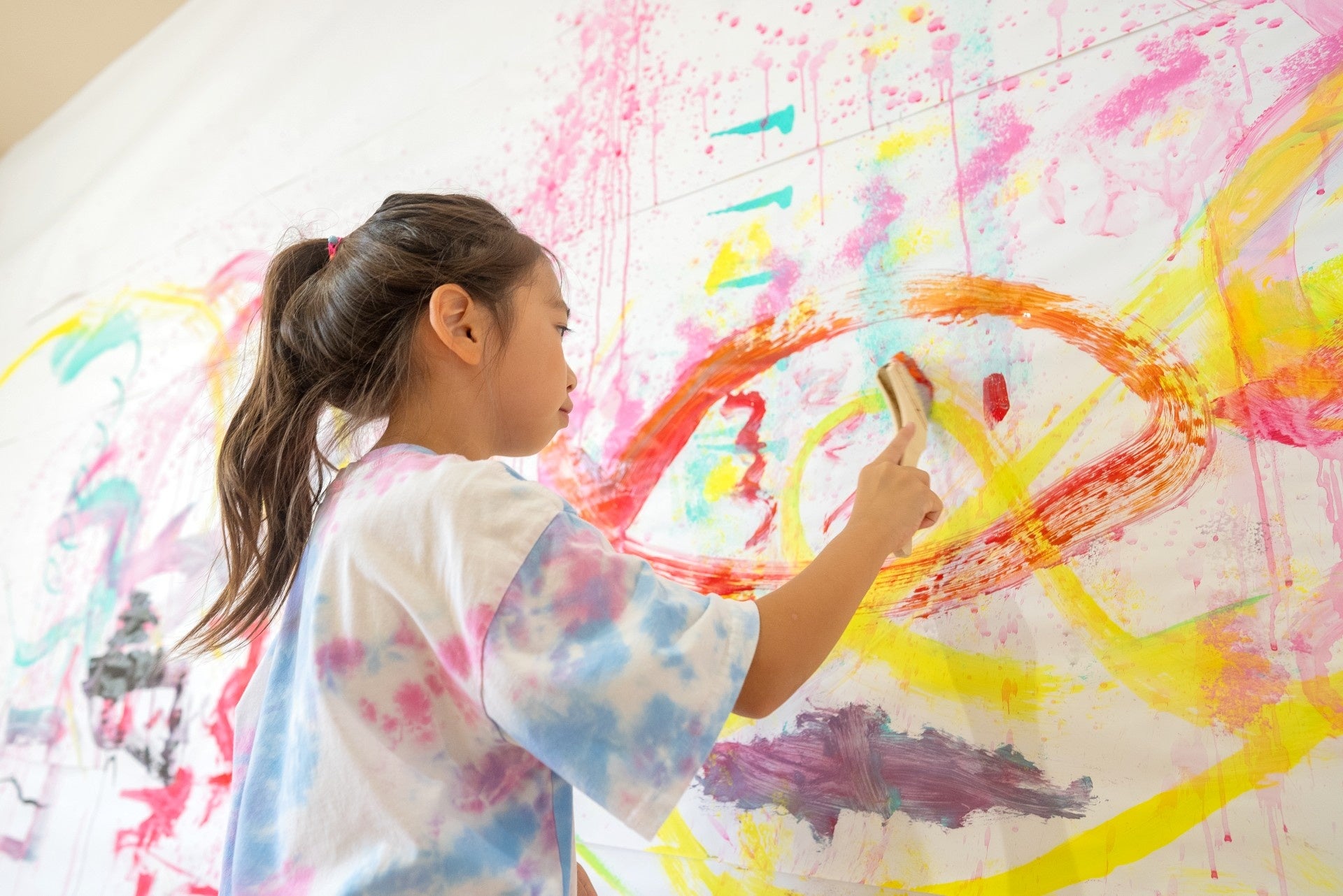 道具一式をお渡しし、壁一面にアクリル絵の具で思う存分ペインティングする抽象的なアート体験。刷毛やローラーを持って大きく身体を動かし、自分の好きな感覚でアートを作り上げていきます。