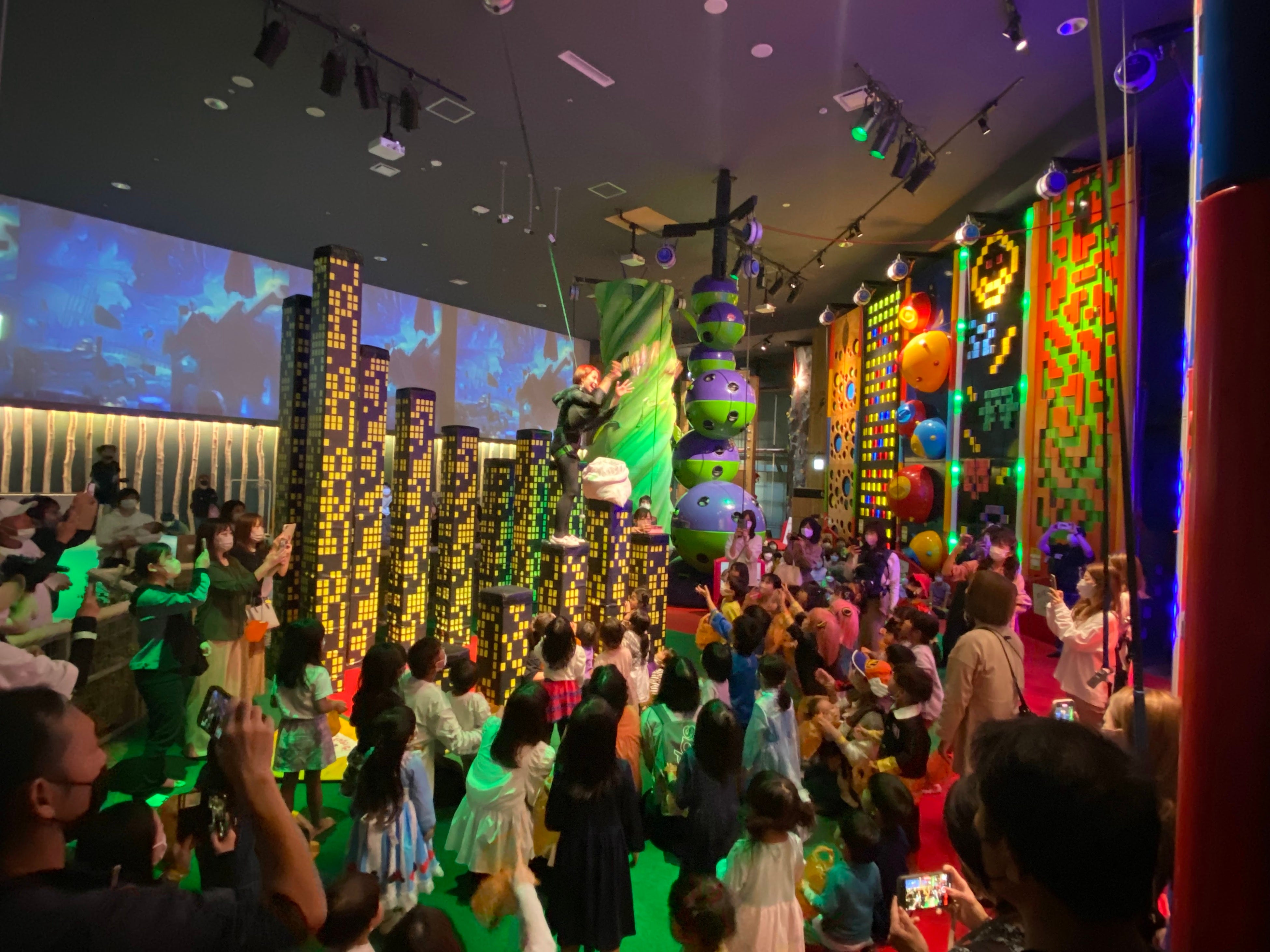 クライミング摩天楼からスタッフがお菓子をまくよ!いっぱいGETしよう!