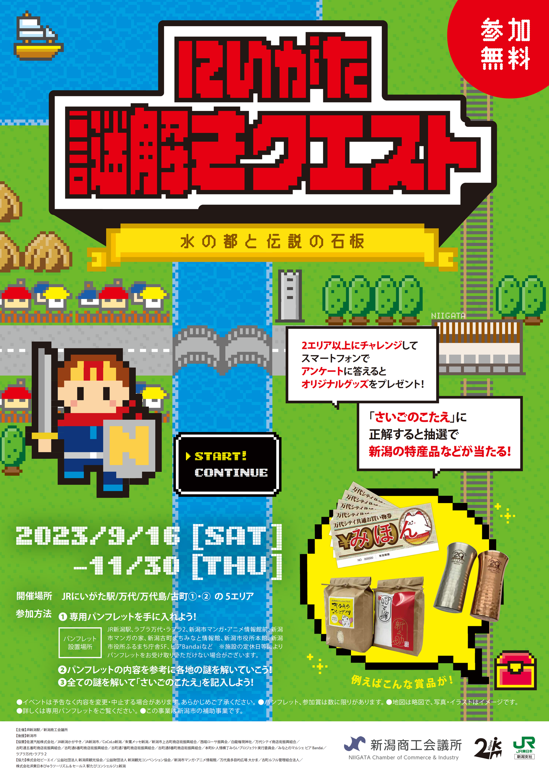 JR東日本 新潟駅では、「にいがた 2 ㎞」エリアにて謎解き街歩きイベント「にいがた謎解 きクエスト~水の都と伝説の石板~」を開催します。 まちを巡りながら謎を解き、新潟の歴史や文化、魅力を体感していただくイベントです。 子どもから大人まで幅広い年齢層の方にお楽しみいただける内容となっています。3 回目の 開催となる今回は「万代島エリア」を新たに加えてエリアを拡大しました。 ぜひ、この機会にまだまだ隠れている新潟の魅力を見つけてみませんか。